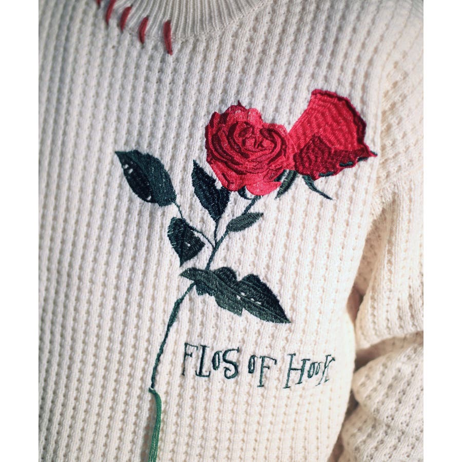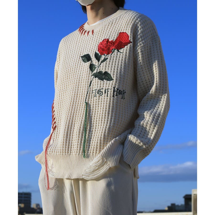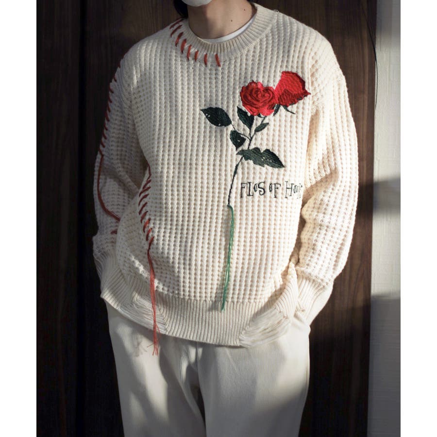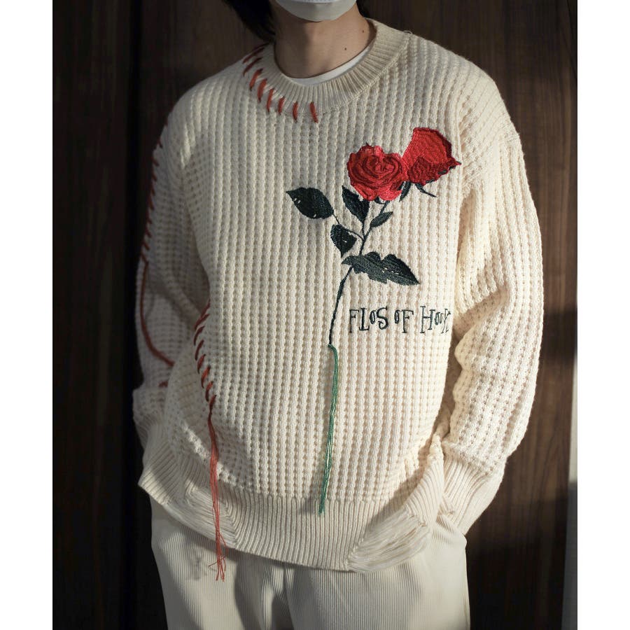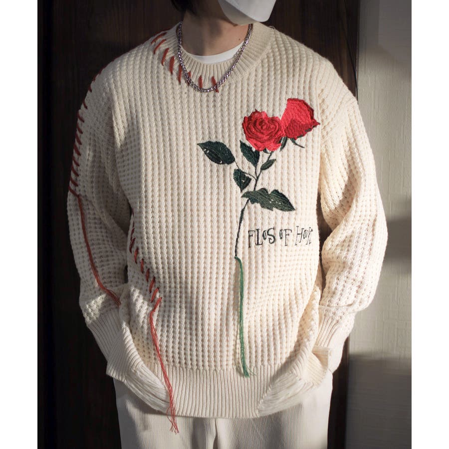 ワッフル編み手縫いステッチバラ刺繍ニット風スウェット ストリート系 オラオラ系