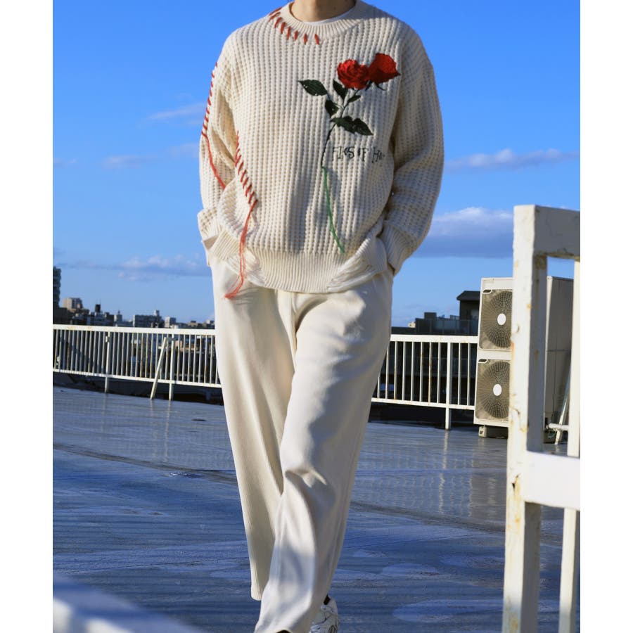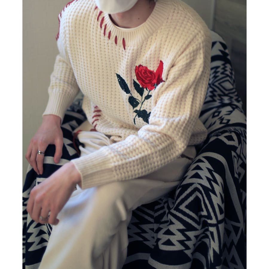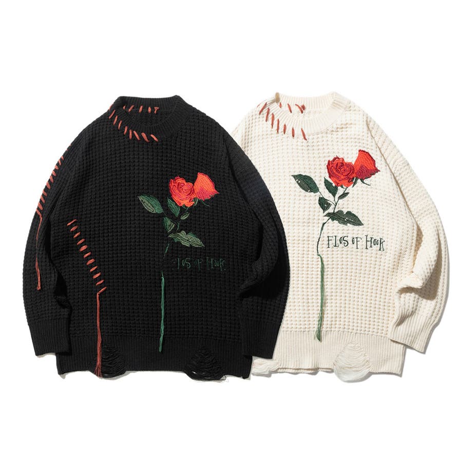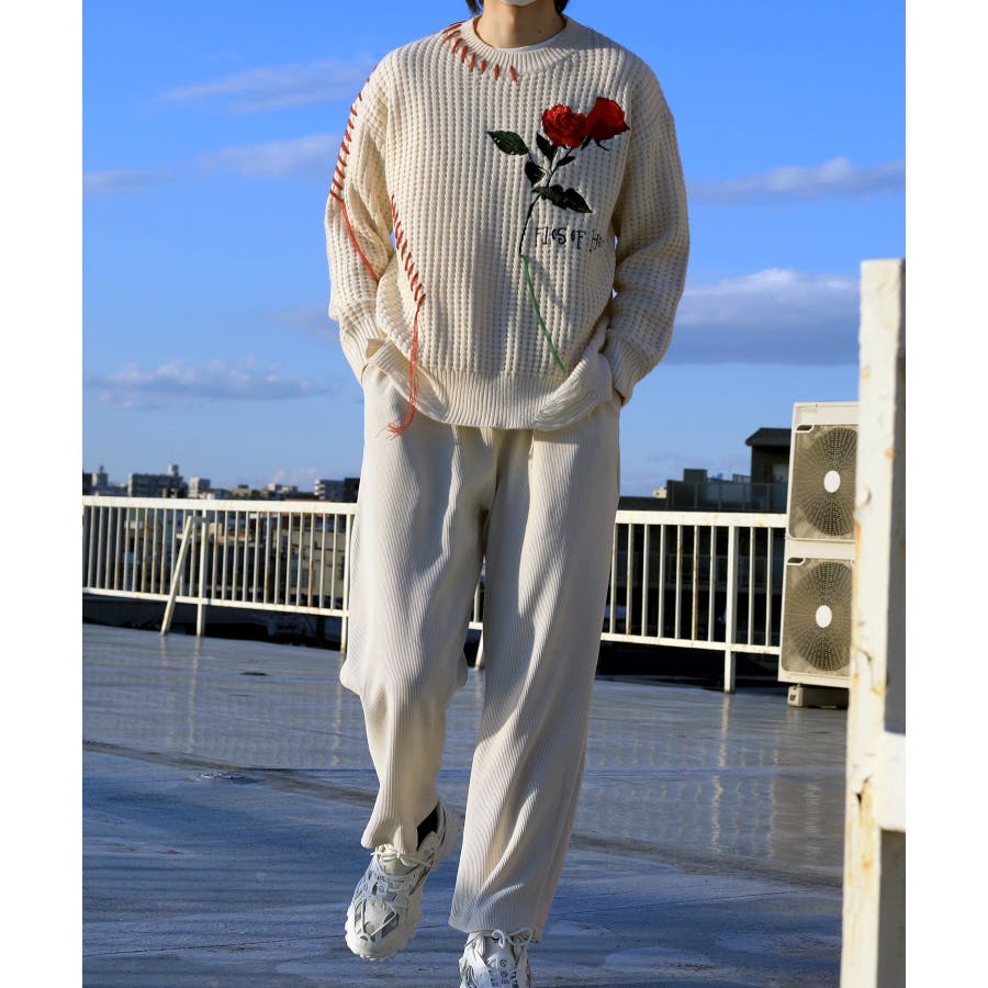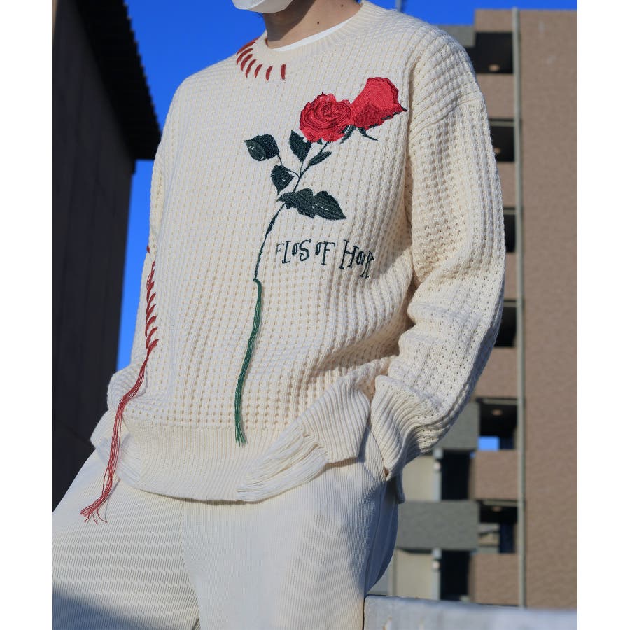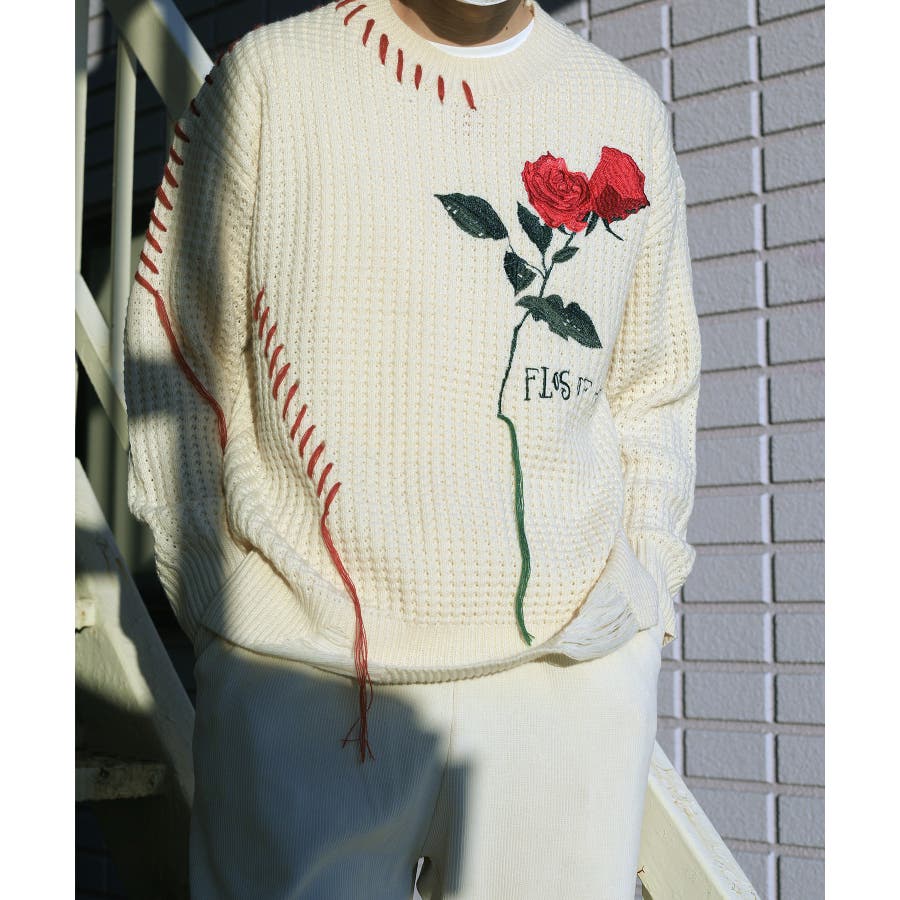 ワッフル編み手縫いステッチバラ刺繍ニット風スウェット ストリート系 オラオラ系