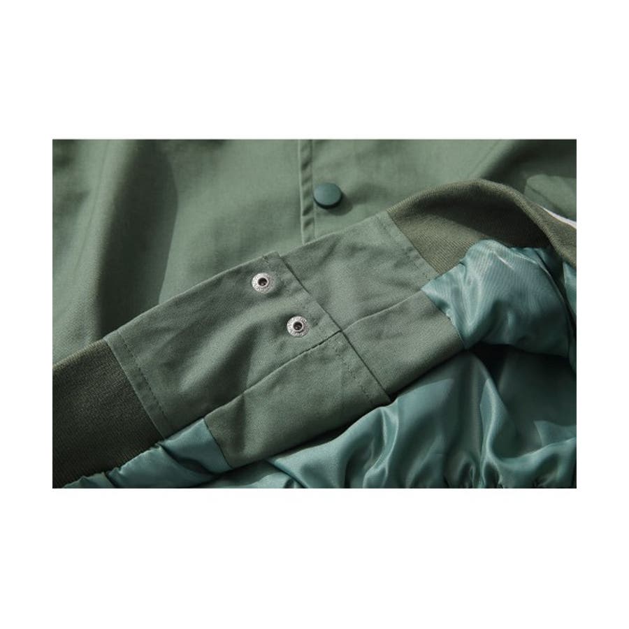 襟や袖口、裾周りのリブのラインと前立て中央の同色ドットボタンが味わいのあるレトロなアクセントを強調。