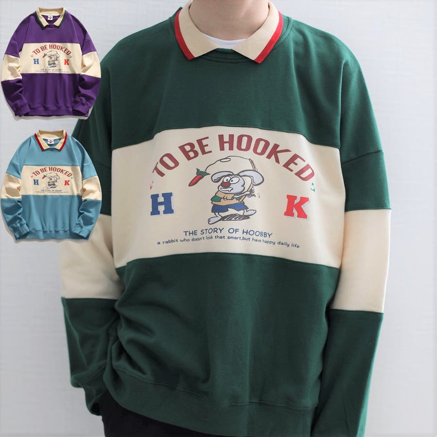 トレーナー HOOK ヴィンテージ風アメカジイラストプリント切り替えポロ襟スウェ…