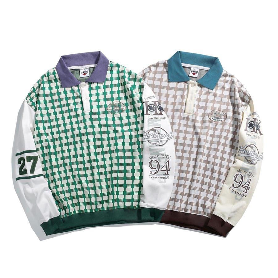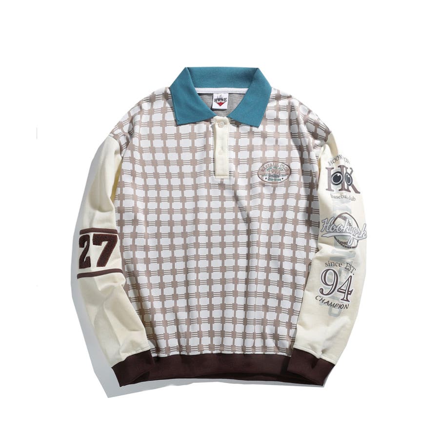 ポロシャツ古着風アメカジチェック切り替えポロスウェット ストリート系 ロンT
