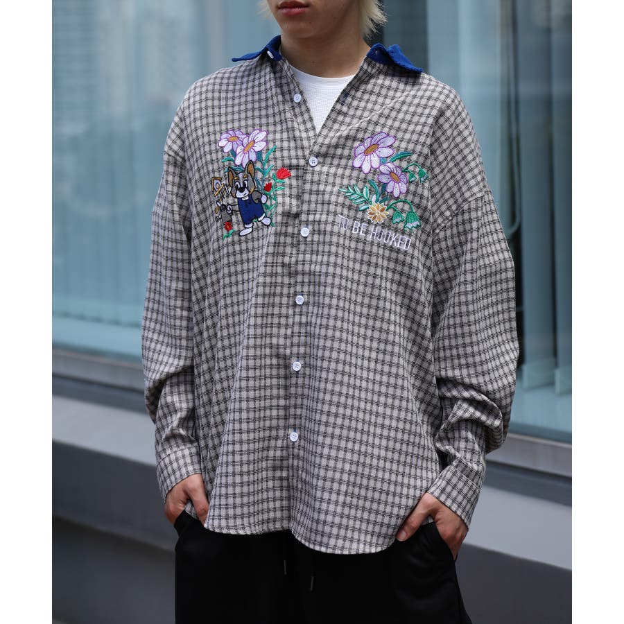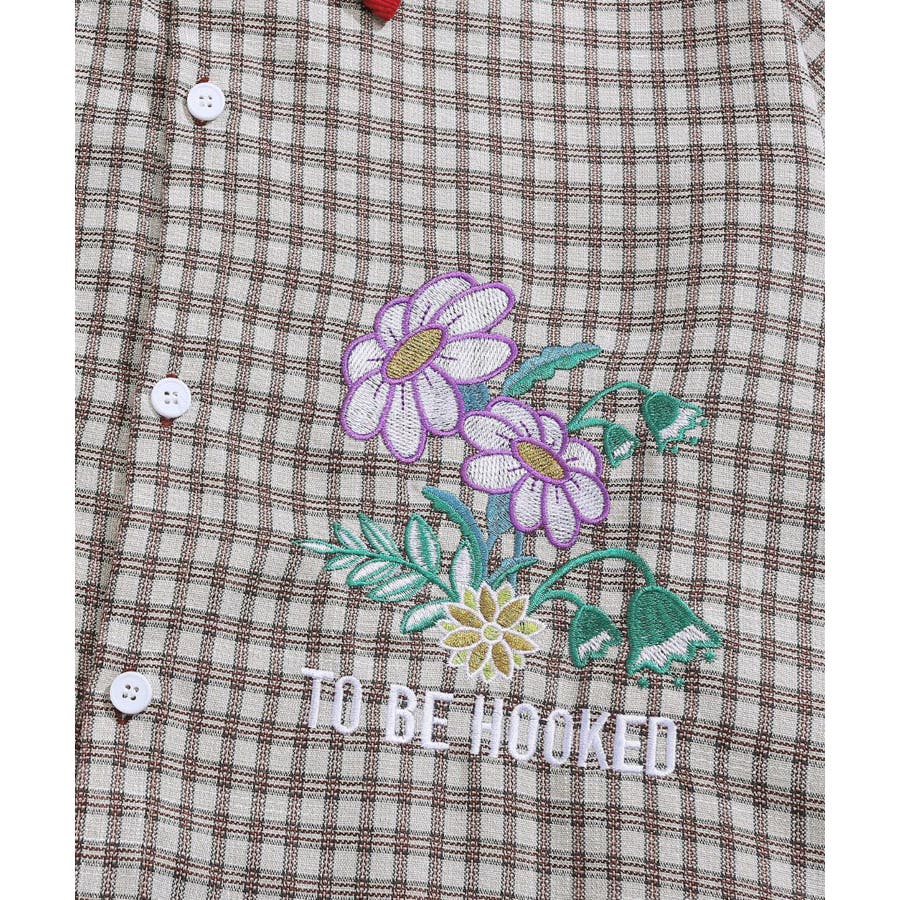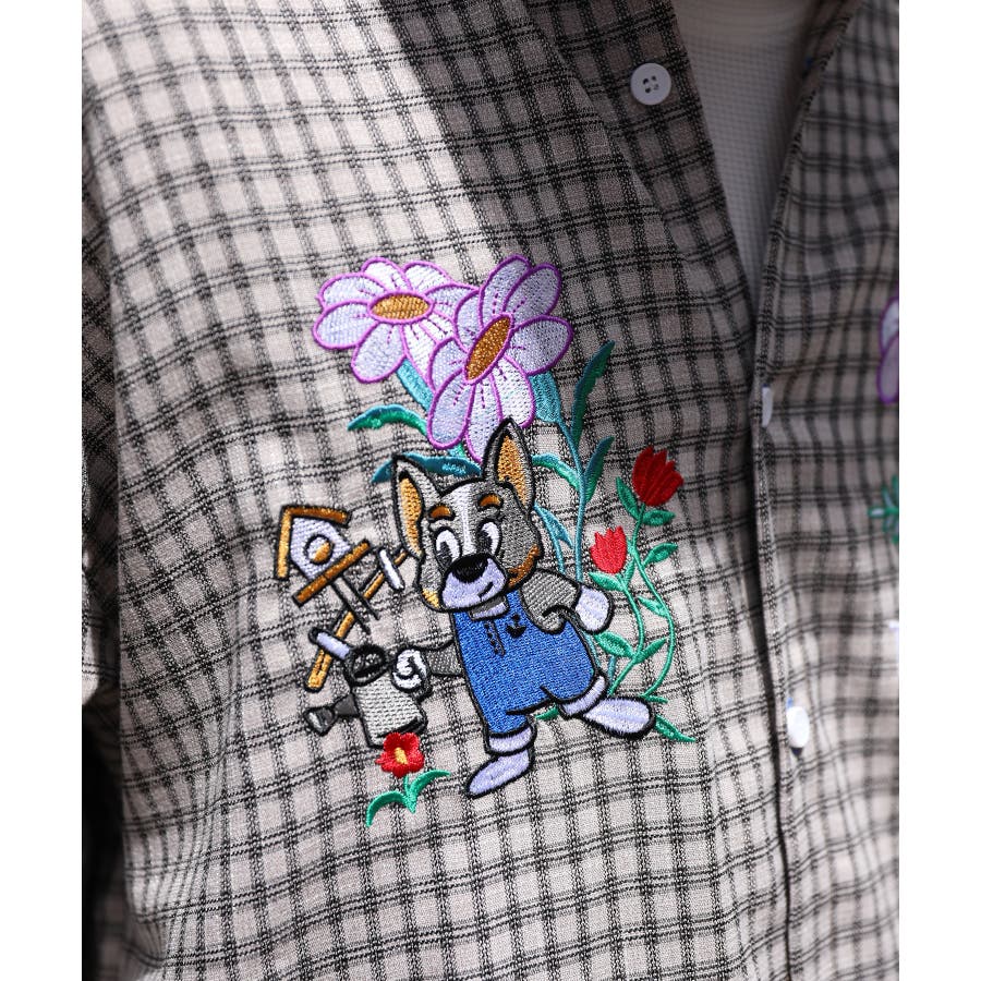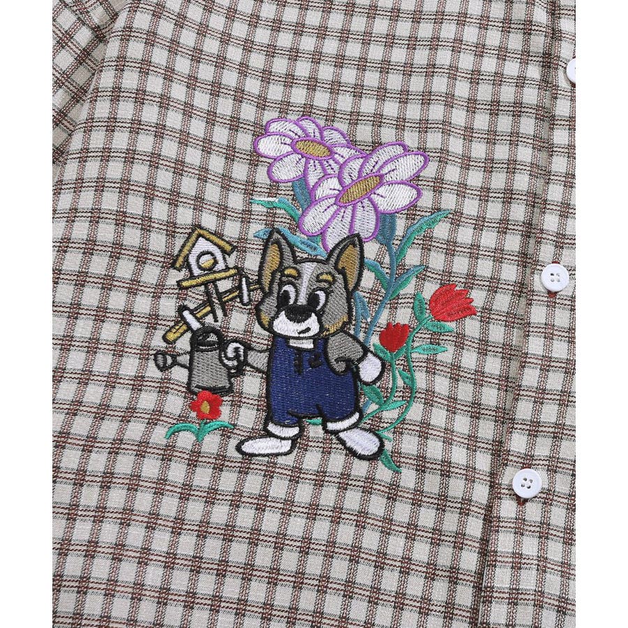 レトロ調可愛いワンちゃん刺繍チェック柄長袖シャツ