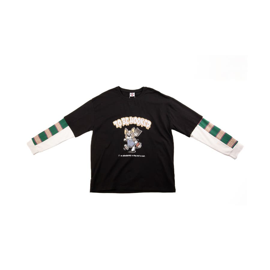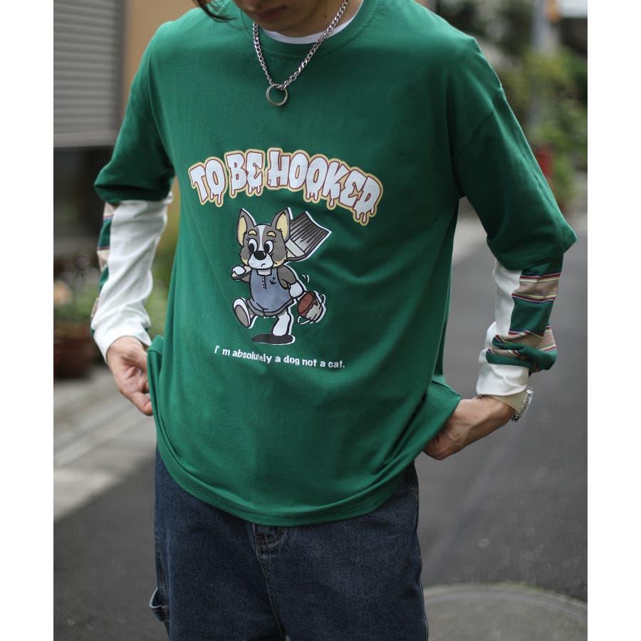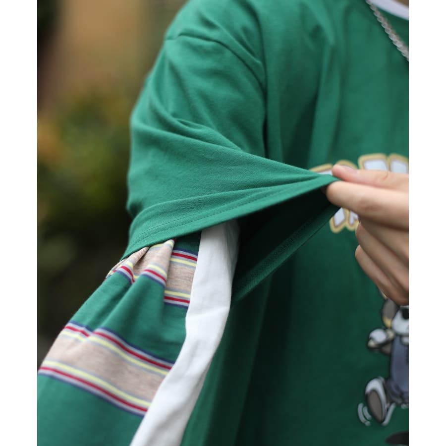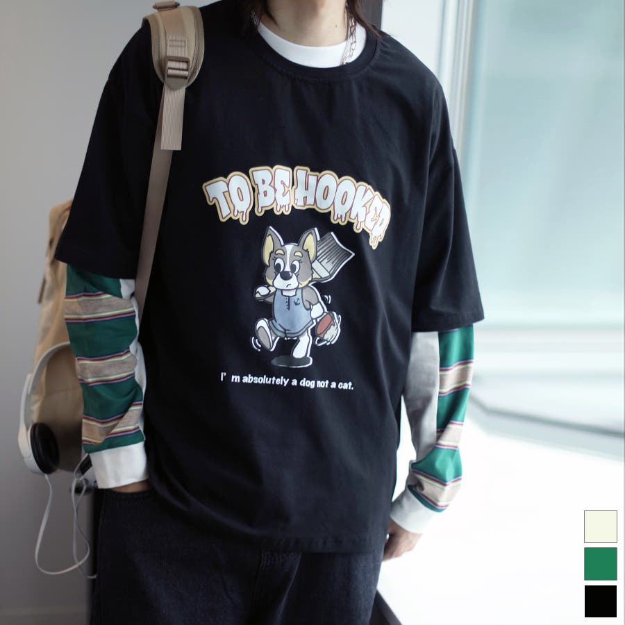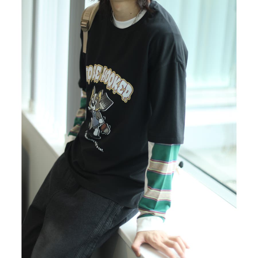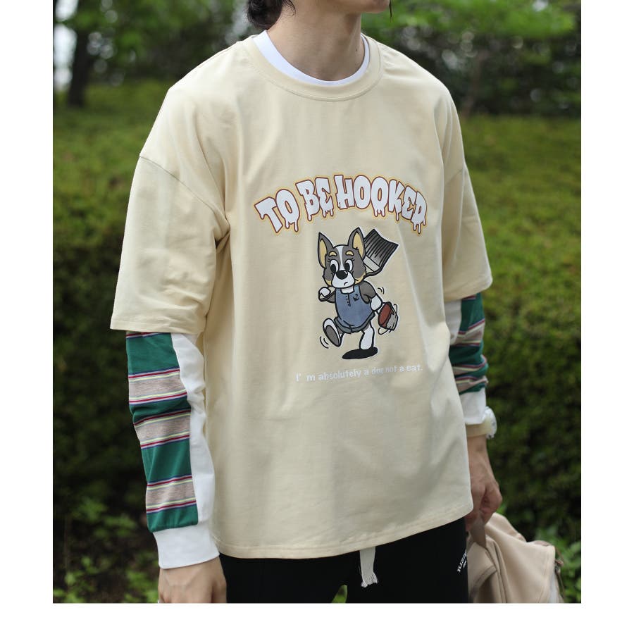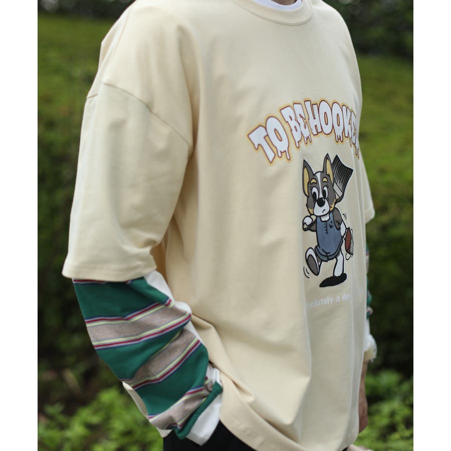かわいいカートゥーンプリントボーダー切り替え袖TEE ロンT 韓国ファッション