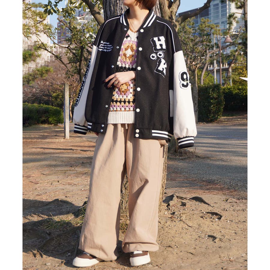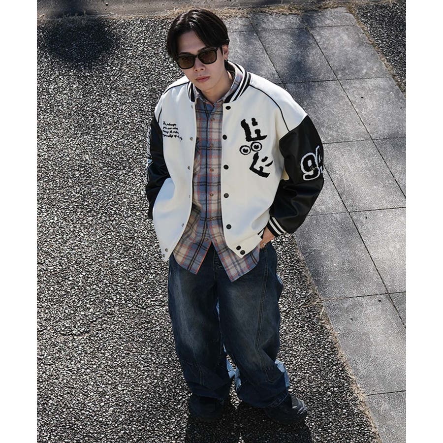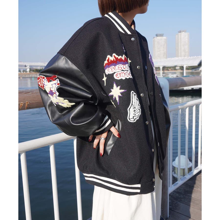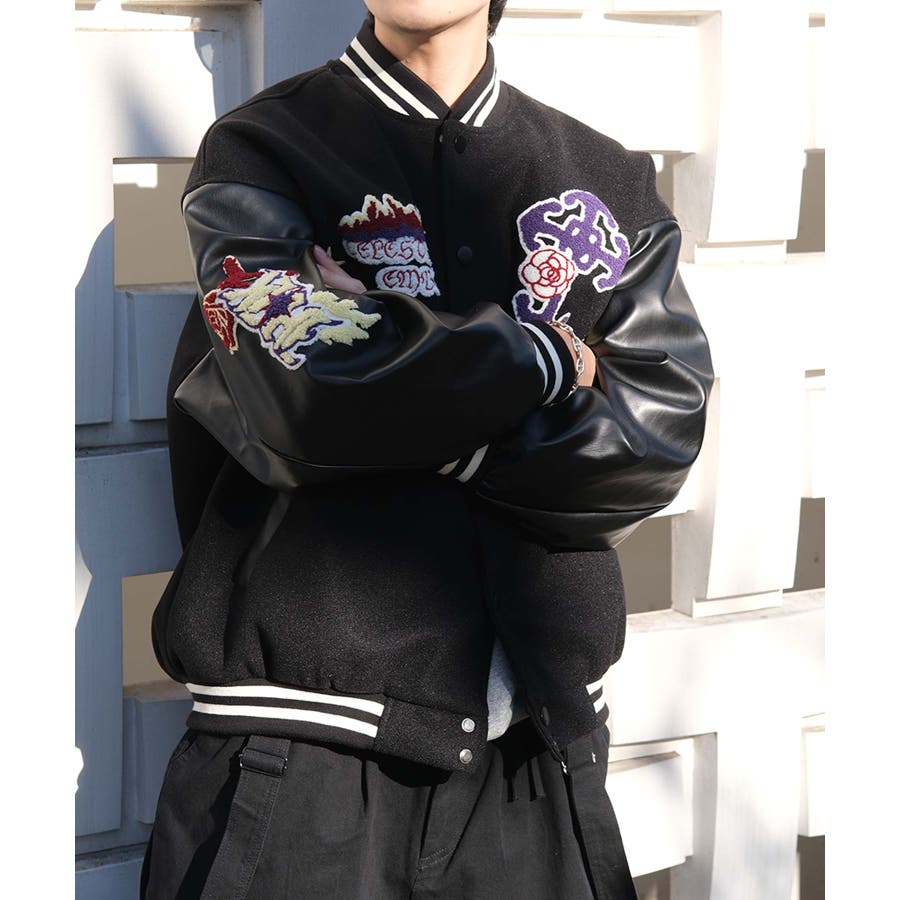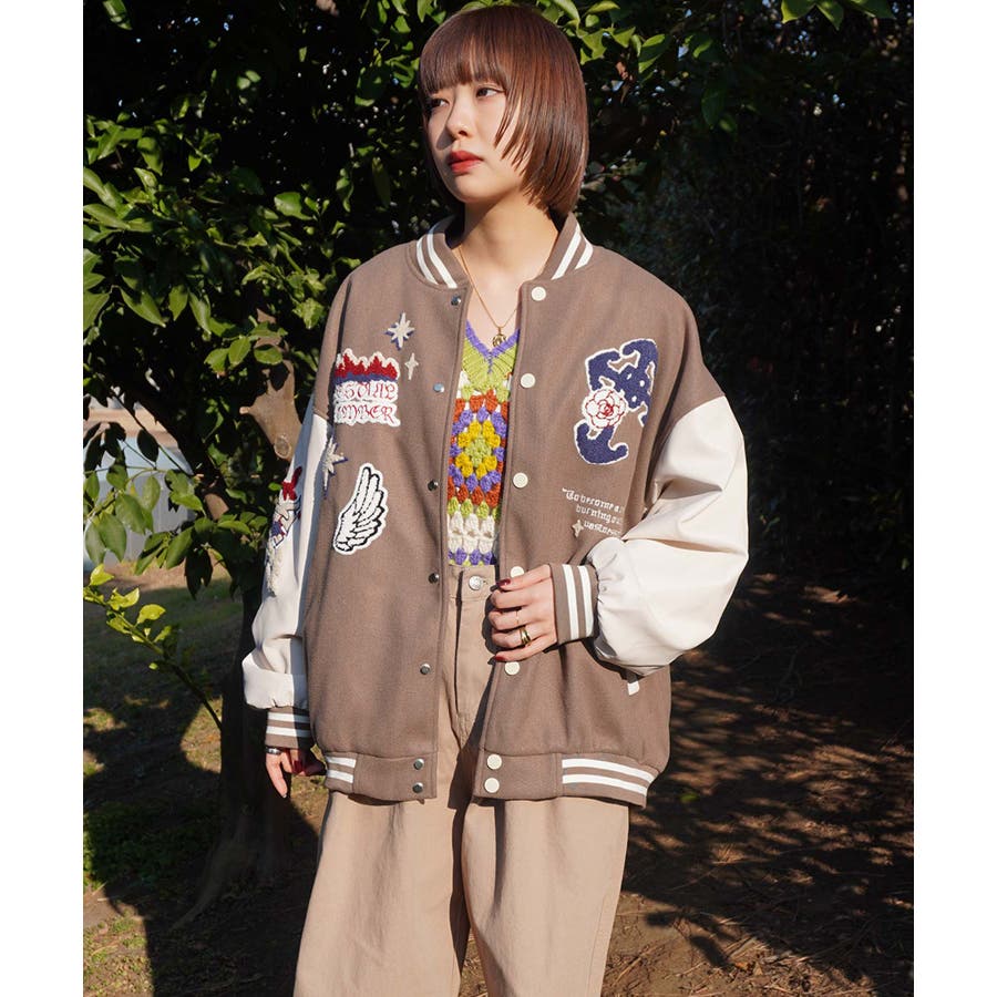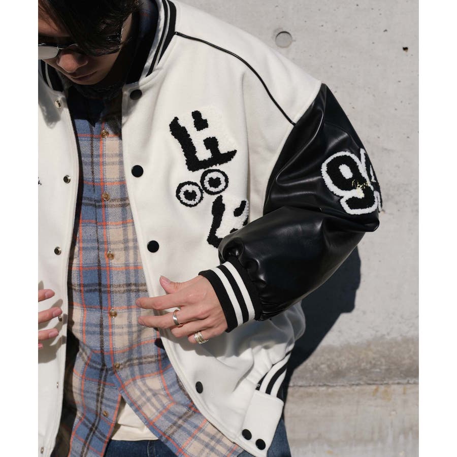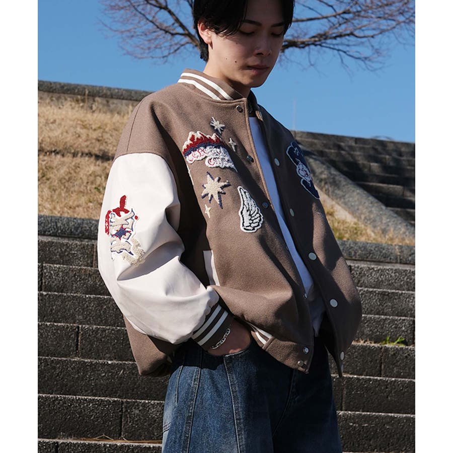 古着のような風合いが魅力のアメカジカレッジ風のスタジャン柔らかなウールライクな生地は暖かく、肌触り抜群袖はクールなPUレザー素材で切り替え、カジュアルながらも上品な印象にオーバーサイズシルエットで、どんな体型の方でもリラックスして着こなせます可愛いサガラ刺繍ワッペンがアクセントになり、一枚でコーディネートの主役になること間違いなしこれからの季節のレイヤードスタイルに重宝するオーバーサイズシルエットが魅力です。ジョガーパンツやスキニーパンツと合わせたスポーツ系ファッション、シャツやデニムパンツと合わせて80s USAカジュアルコーディネートも手軽に楽しめます。TシャツやロンT、パーカーの上から羽織って重ね着にも使えるので、ストリートコーデのアウターとして着回しやすく万能アウターとして活躍できます。