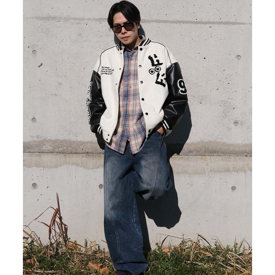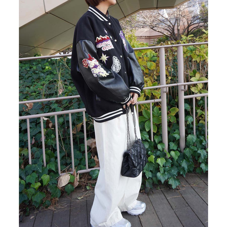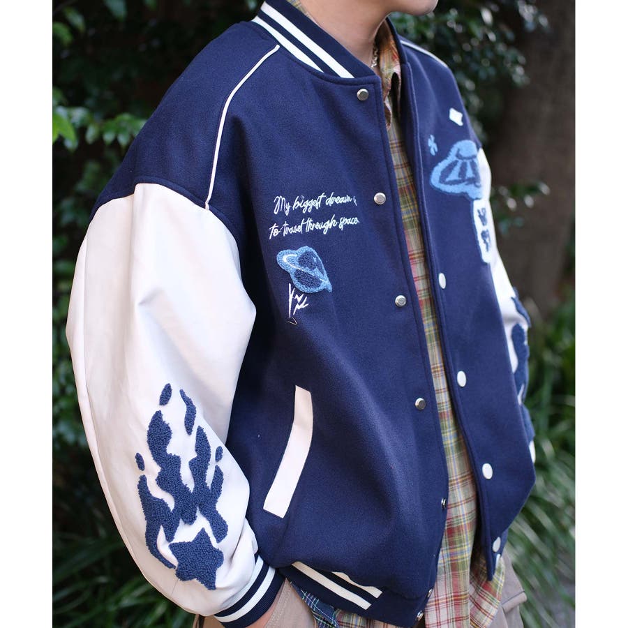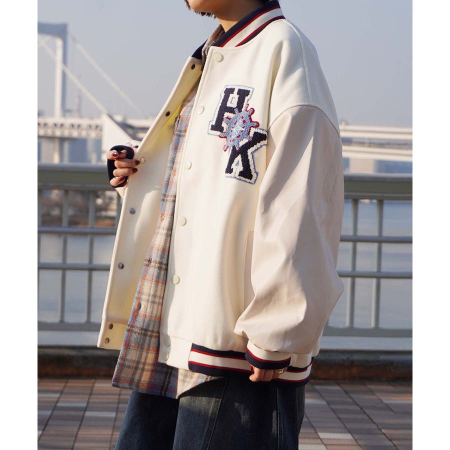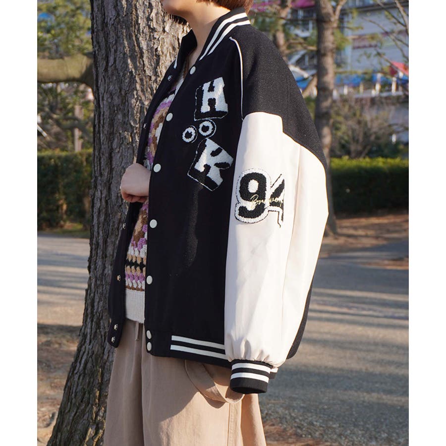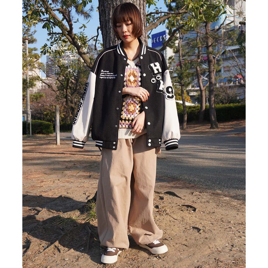 古着のような風合いが魅力のアメカジカレッジ風のスタジャン柔らかなウールライクな生地は暖かく、肌触り抜群袖はクールなPUレザー素材で切り替え、カジュアルながらも上品な印象にオーバーサイズシルエットで、どんな体型の方でもリラックスして着こなせます可愛いサガラ刺繍ワッペンがアクセントになり、一枚でコーディネートの主役になること間違いなしこれからの季節のレイヤードスタイルに重宝するオーバーサイズシルエットが魅力です。ジョガーパンツやスキニーパンツと合わせたスポーツ系ファッション、シャツやデニムパンツと合わせて80s USAカジュアルコーディネートも手軽に楽しめます。TシャツやロンT、パーカーの上から羽織って重ね着にも使えるので、ストリートコーデのアウターとして着回しやすく万能アウターとして活躍できます。
