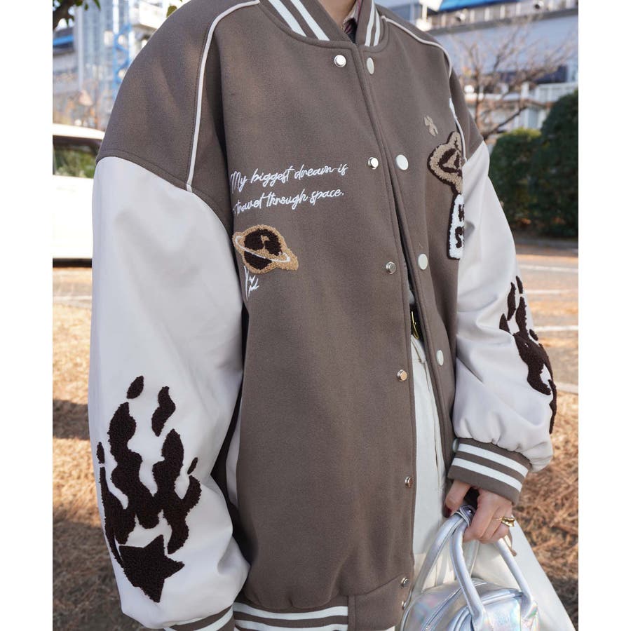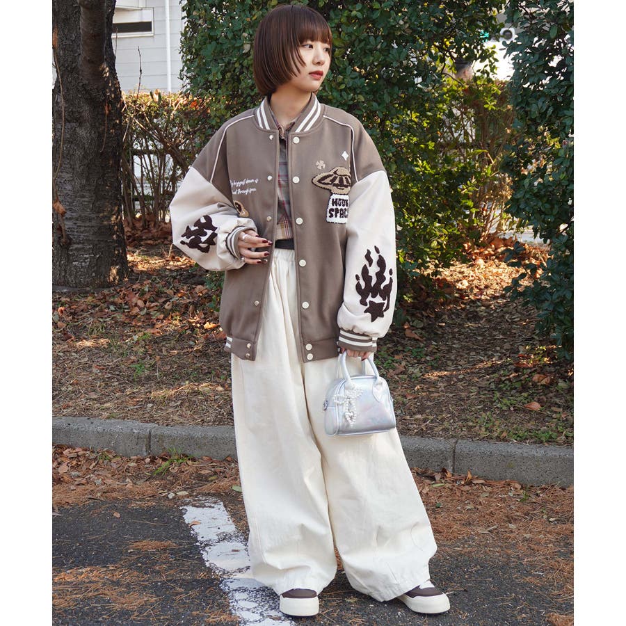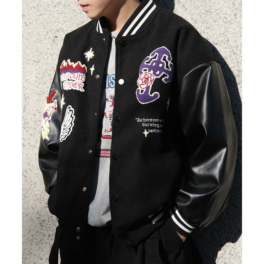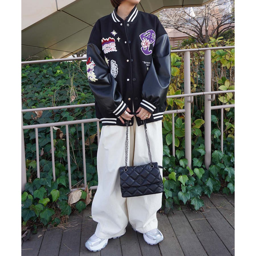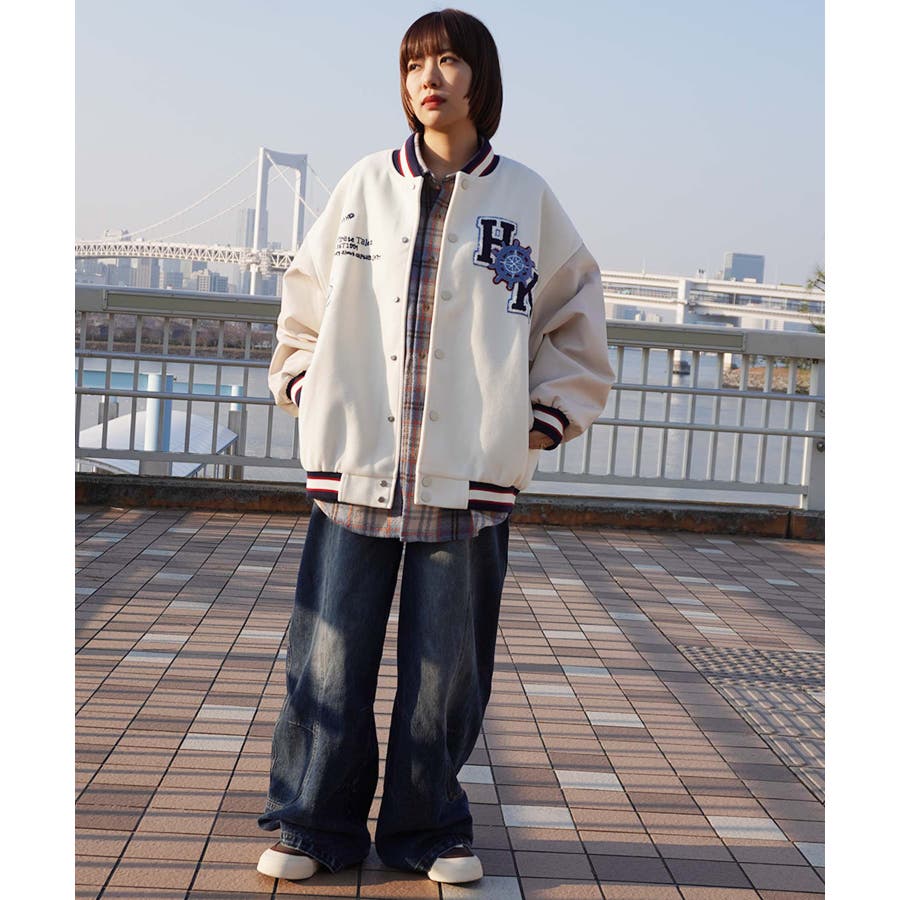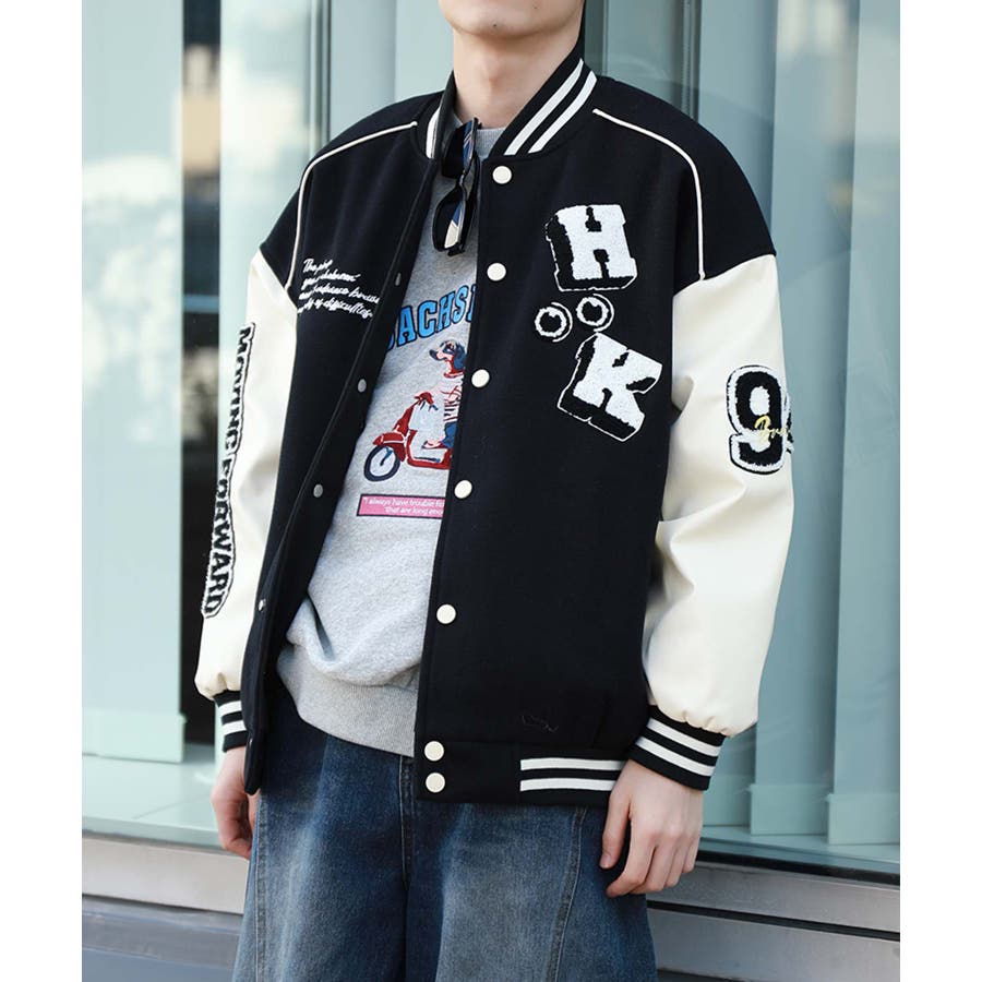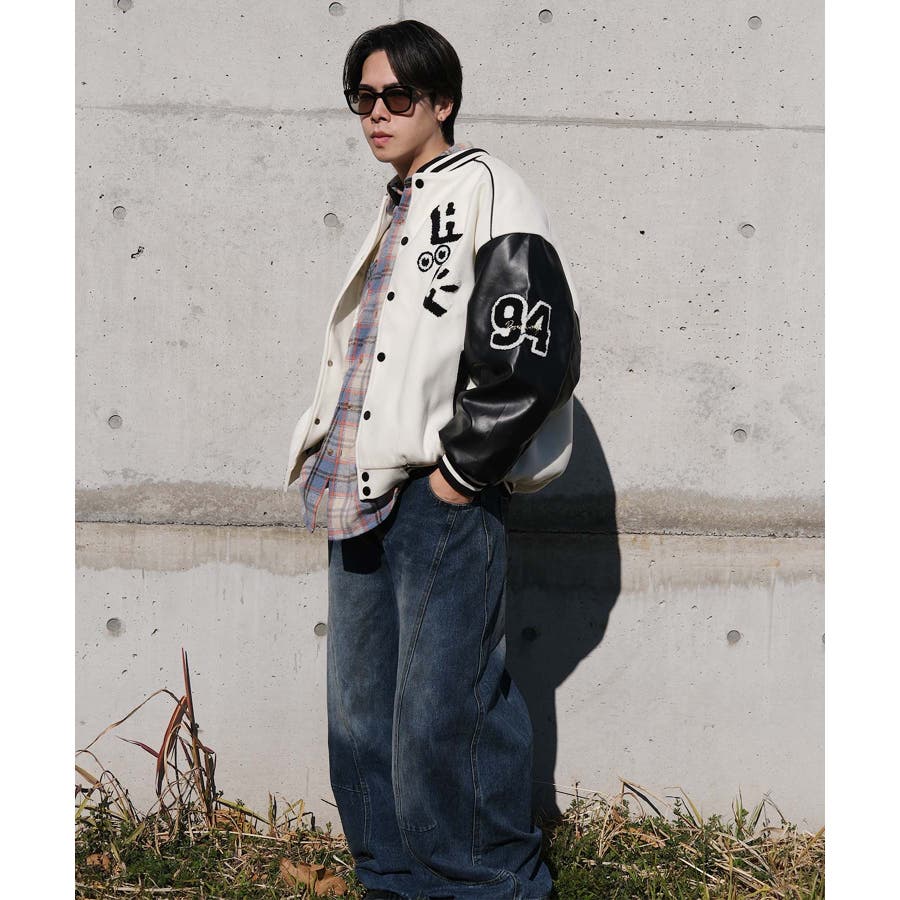 古着のような風合いが魅力のアメカジカレッジ風のスタジャン柔らかなウールライクな生地は暖かく、肌触り抜群袖はクールなPUレザー素材で切り替え、カジュアルながらも上品な印象にオーバーサイズシルエットで、どんな体型の方でもリラックスして着こなせます可愛いサガラ刺繍ワッペンがアクセントになり、一枚でコーディネートの主役になること間違いなしこれからの季節のレイヤードスタイルに重宝するオーバーサイズシルエットが魅力です。ジョガーパンツやスキニーパンツと合わせたスポーツ系ファッション、シャツやデニムパンツと合わせて80s USAカジュアルコーディネートも手軽に楽しめます。TシャツやロンT、パーカーの上から羽織って重ね着にも使えるので、ストリートコーデのアウターとして着回しやすく万能アウターとして活躍できます。
