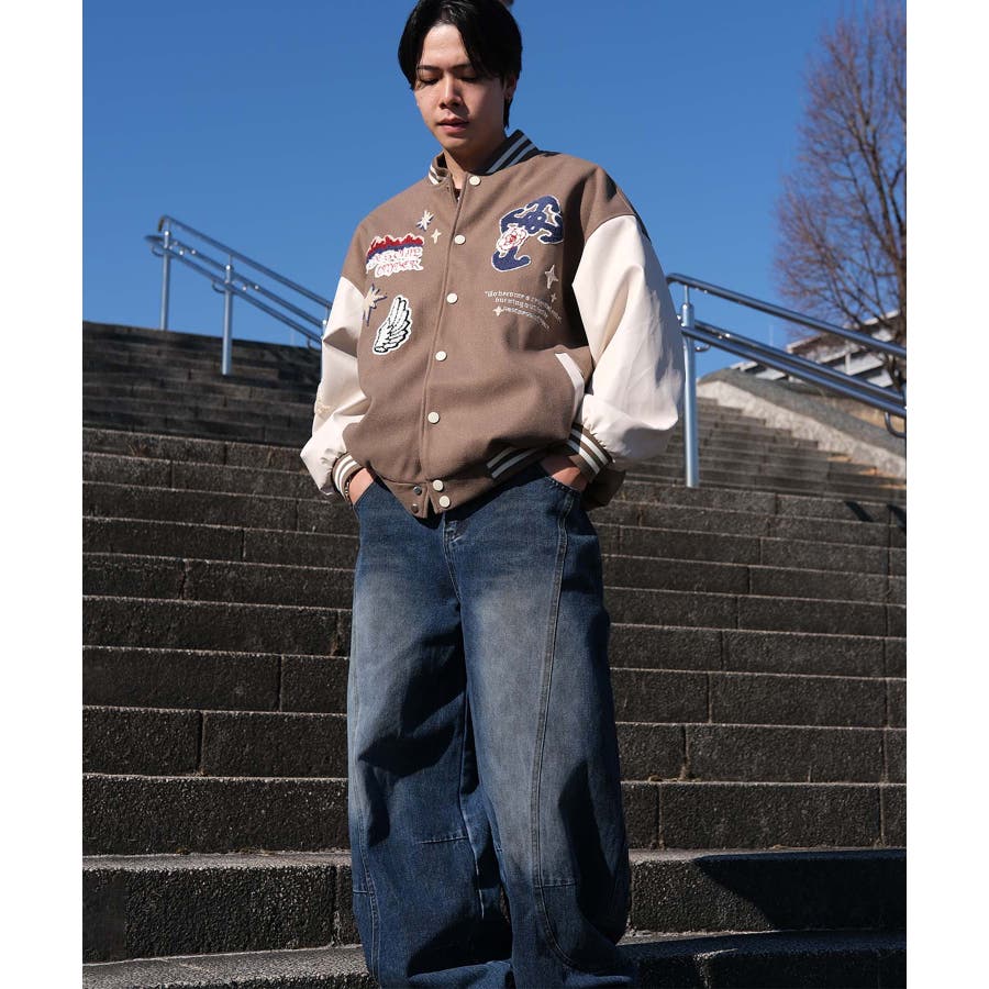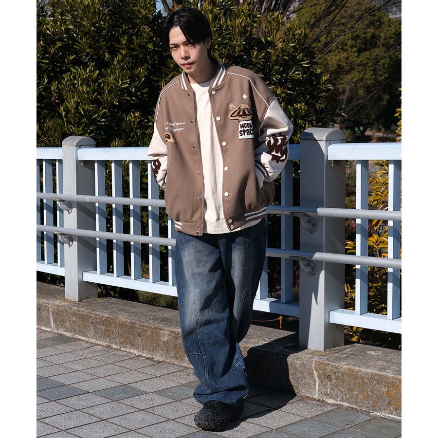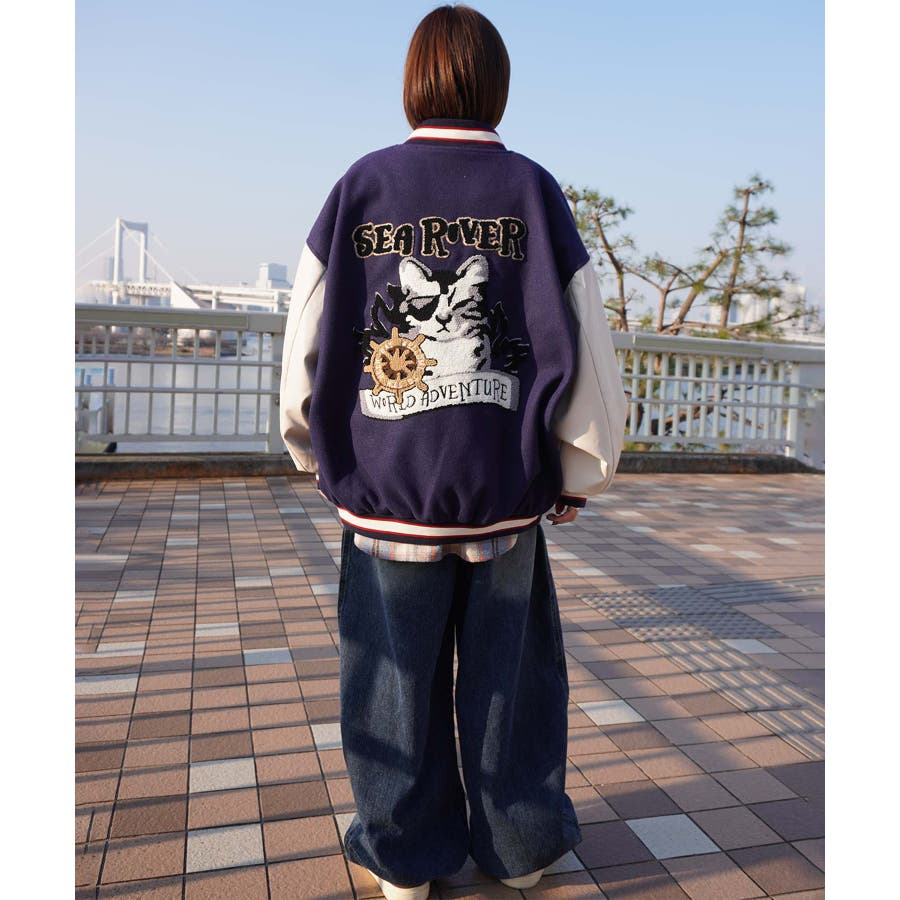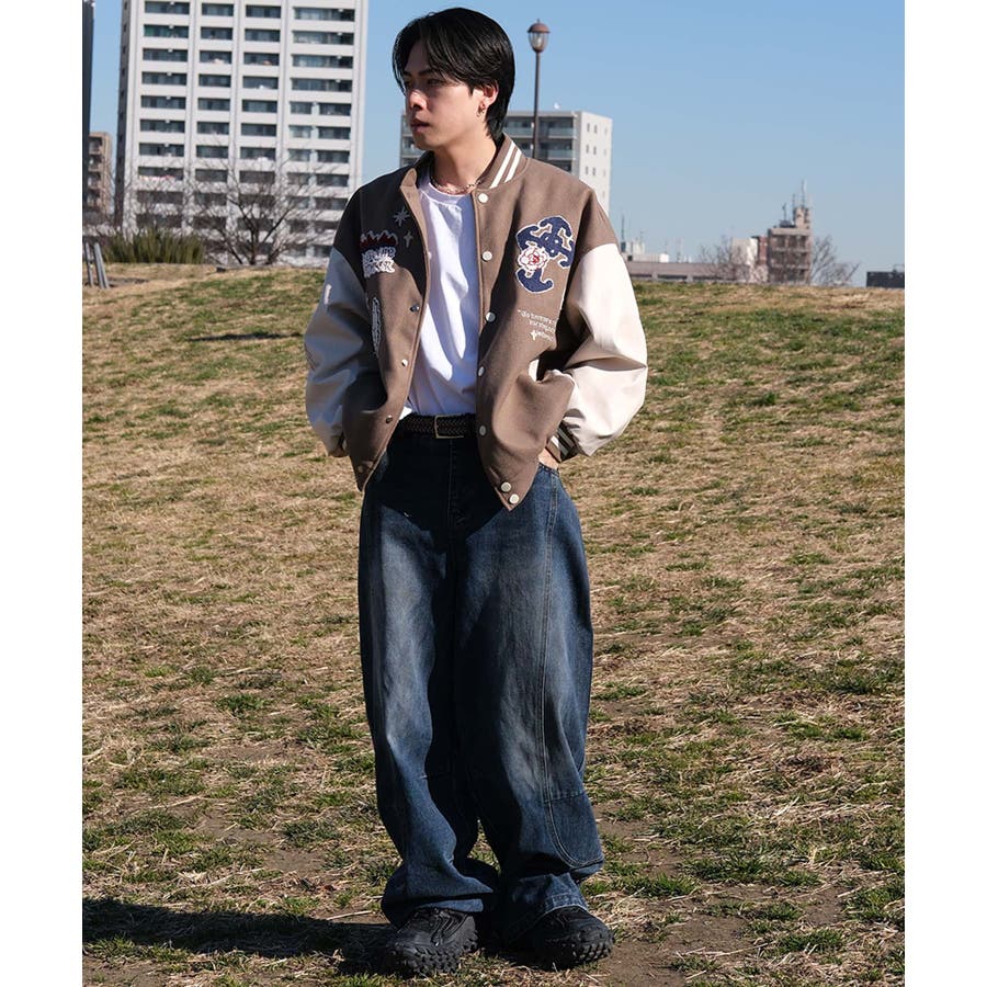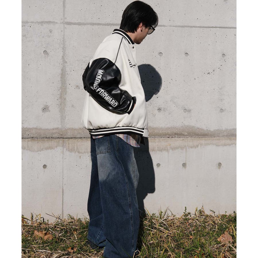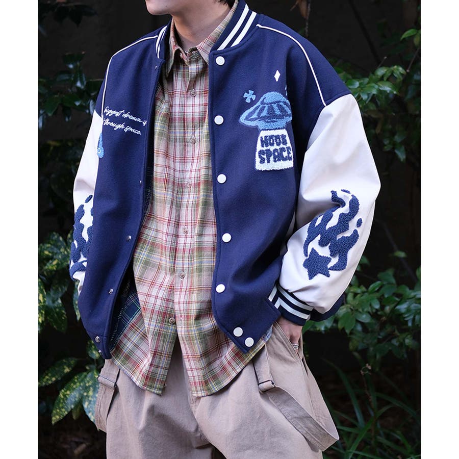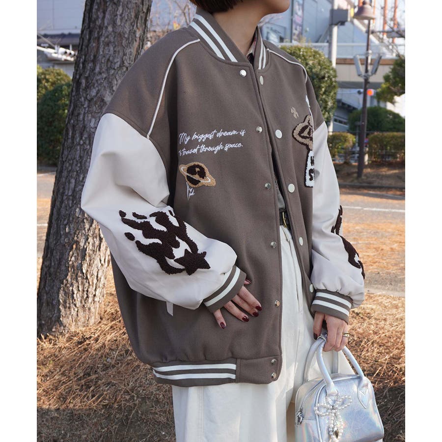 古着のような風合いが魅力のアメカジカレッジ風のスタジャン柔らかなウールライクな生地は暖かく、肌触り抜群袖はクールなPUレザー素材で切り替え、カジュアルながらも上品な印象にオーバーサイズシルエットで、どんな体型の方でもリラックスして着こなせます可愛いサガラ刺繍ワッペンがアクセントになり、一枚でコーディネートの主役になること間違いなしこれからの季節のレイヤードスタイルに重宝するオーバーサイズシルエットが魅力です。ジョガーパンツやスキニーパンツと合わせたスポーツ系ファッション、シャツやデニムパンツと合わせて80s USAカジュアルコーディネートも手軽に楽しめます。TシャツやロンT、パーカーの上から羽織って重ね着にも使えるので、ストリートコーデのアウターとして着回しやすく万能アウターとして活躍できます。