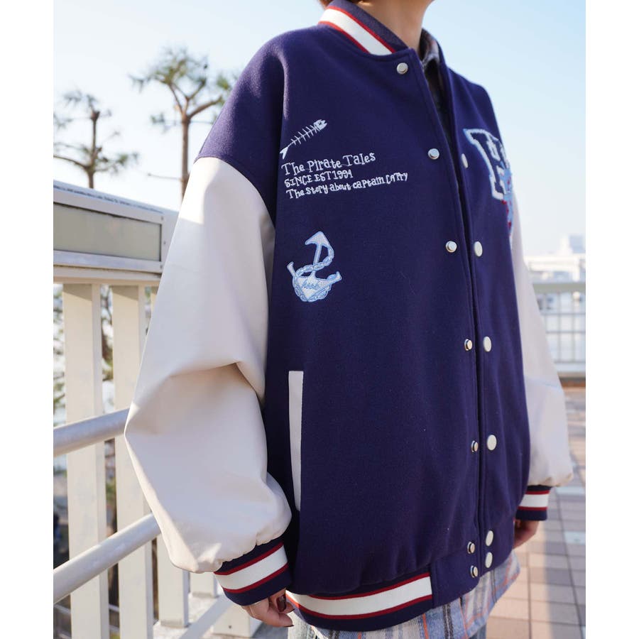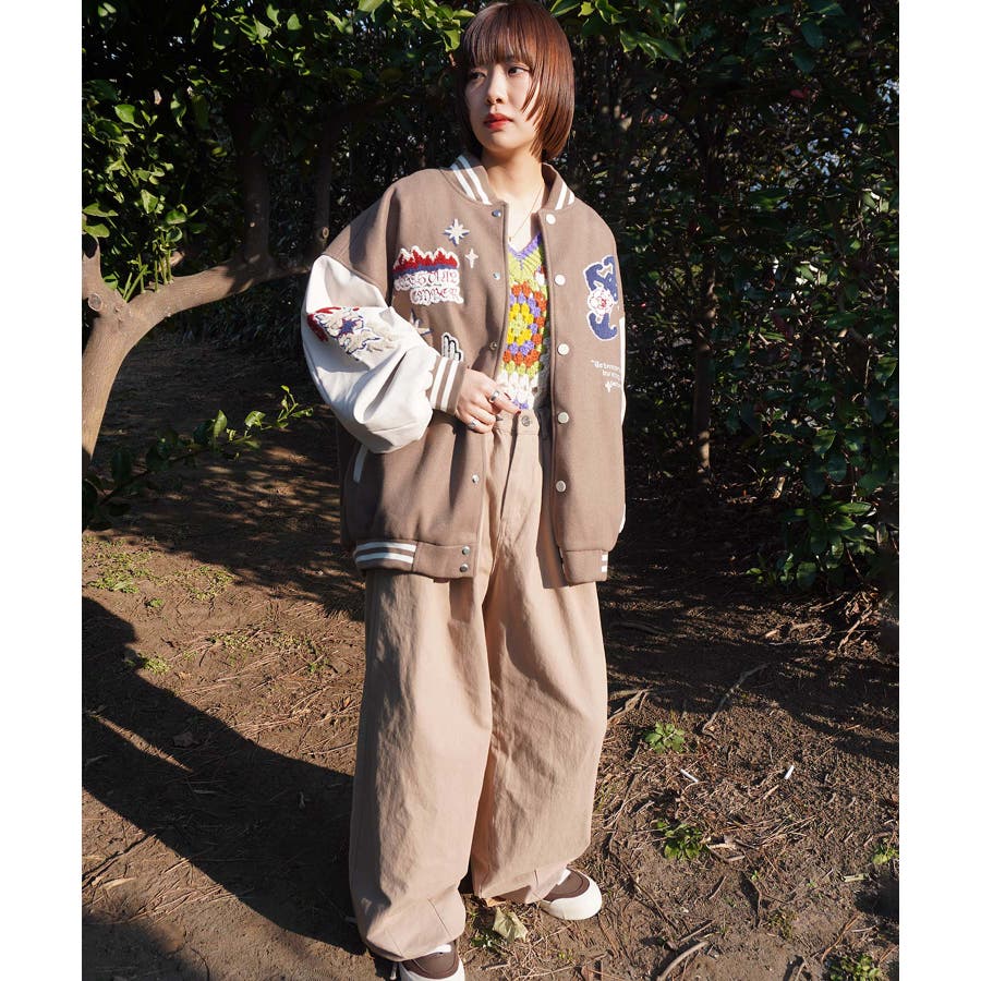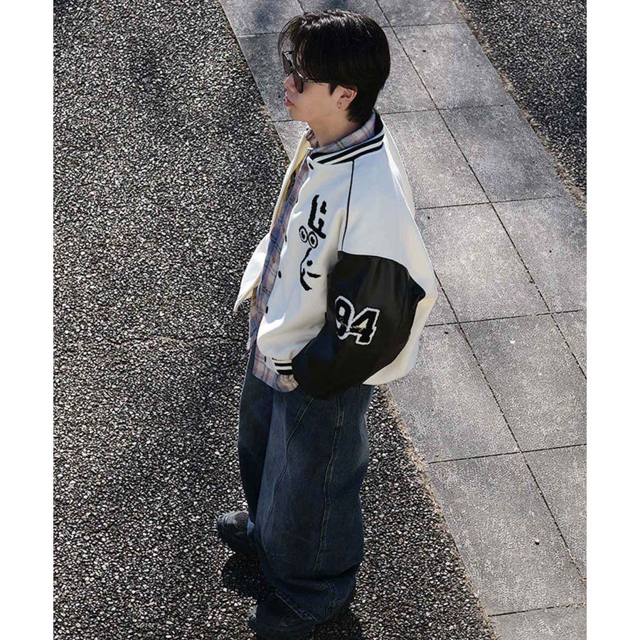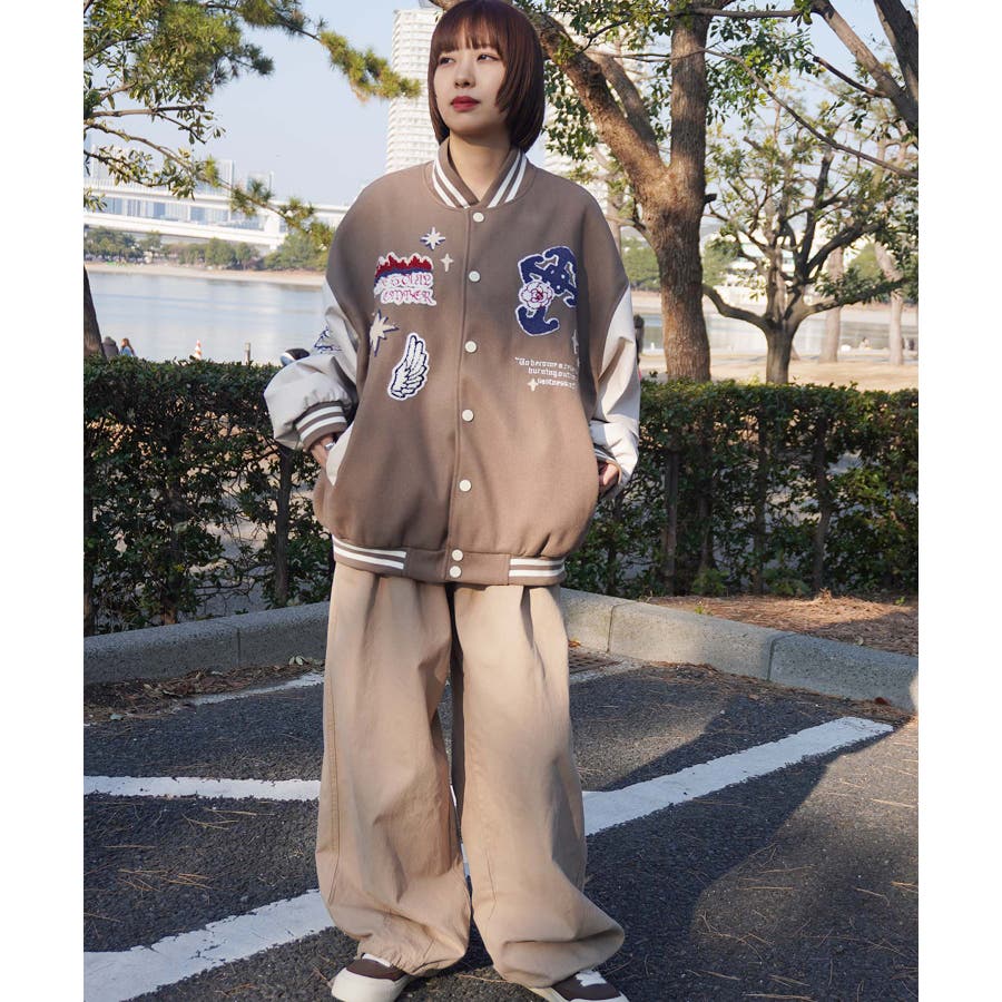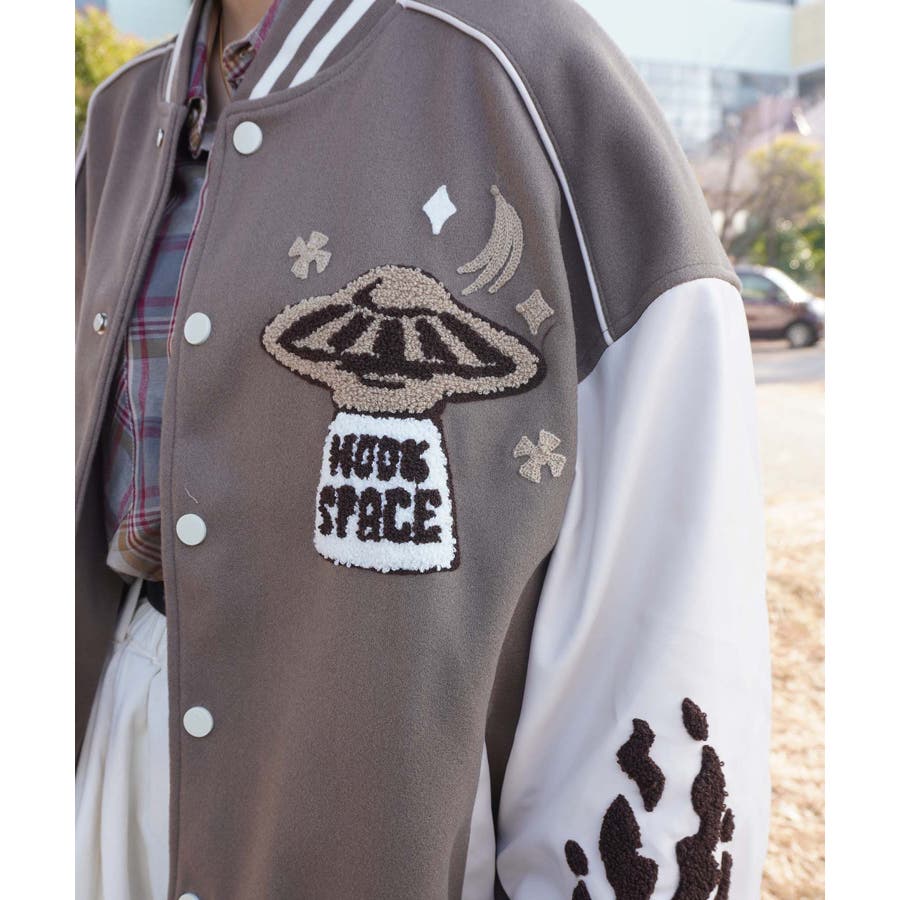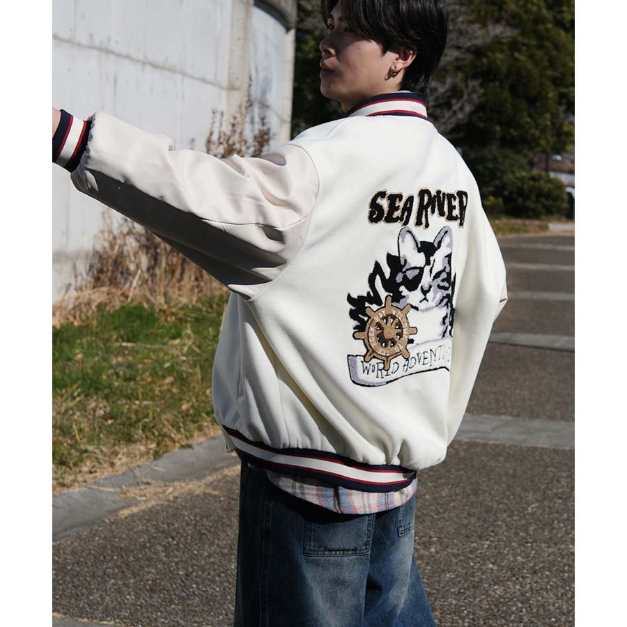 古着のような風合いが魅力のアメカジカレッジ風のスタジャン柔らかなウールライクな生地は暖かく、肌触り抜群袖はクールなPUレザー素材で切り替え、カジュアルながらも上品な印象にオーバーサイズシルエットで、どんな体型の方でもリラックスして着こなせます可愛いサガラ刺繍ワッペンがアクセントになり、一枚でコーディネートの主役になること間違いなしこれからの季節のレイヤードスタイルに重宝するオーバーサイズシルエットが魅力です。ジョガーパンツやスキニーパンツと合わせたスポーツ系ファッション、シャツやデニムパンツと合わせて80s USAカジュアルコーディネートも手軽に楽しめます。TシャツやロンT、パーカーの上から羽織って重ね着にも使えるので、ストリートコーデのアウターとして着回しやすく万能アウターとして活躍できます。