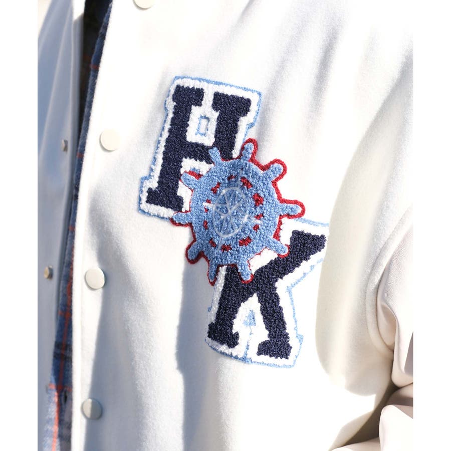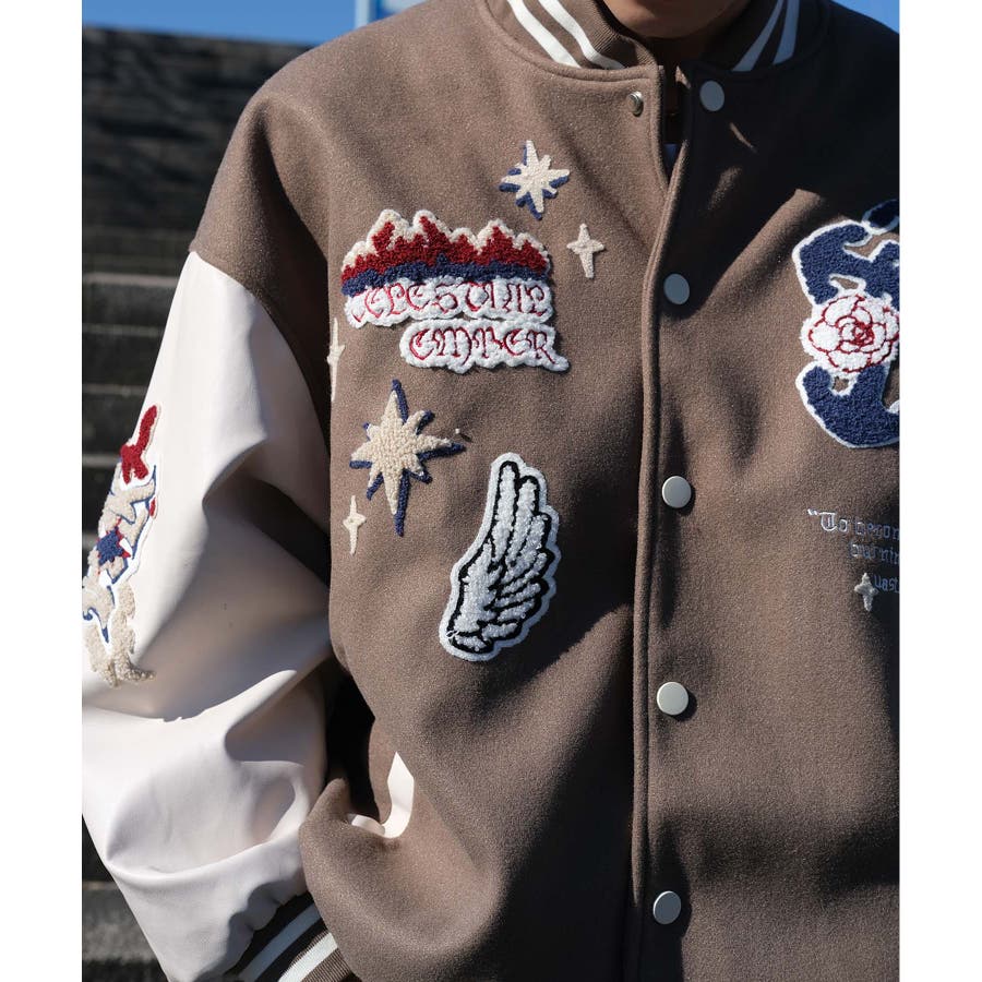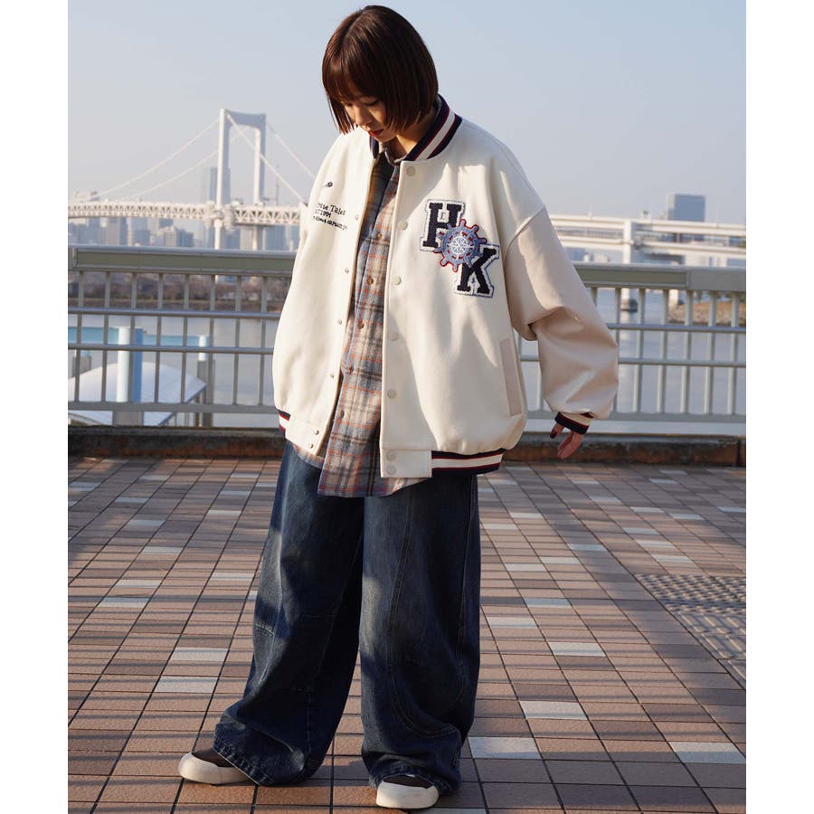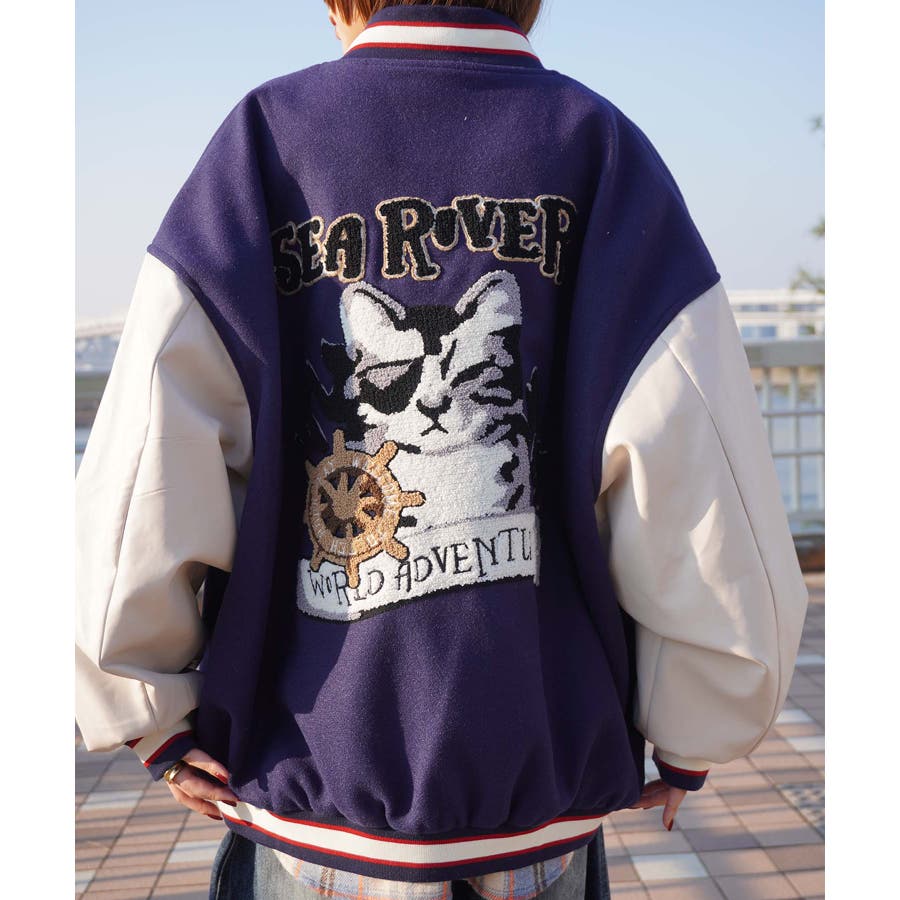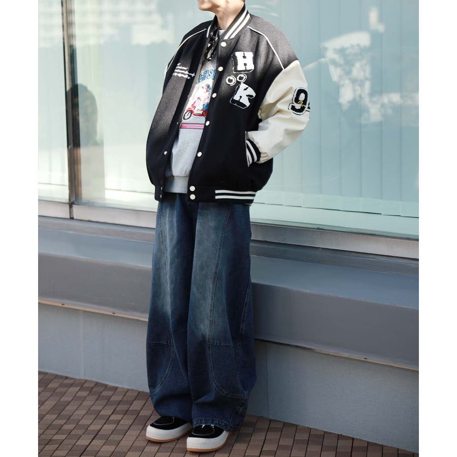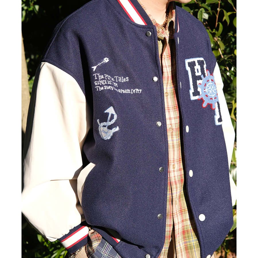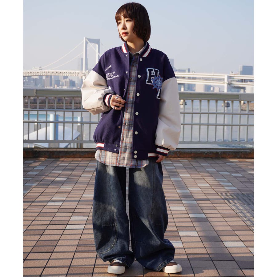 古着のような風合いが魅力のアメカジカレッジ風のスタジャン柔らかなウールライクな生地は暖かく、肌触り抜群袖はクールなPUレザー素材で切り替え、カジュアルながらも上品な印象にオーバーサイズシルエットで、どんな体型の方でもリラックスして着こなせます可愛いサガラ刺繍ワッペンがアクセントになり、一枚でコーディネートの主役になること間違いなしこれからの季節のレイヤードスタイルに重宝するオーバーサイズシルエットが魅力です。ジョガーパンツやスキニーパンツと合わせたスポーツ系ファッション、シャツやデニムパンツと合わせて80s USAカジュアルコーディネートも手軽に楽しめます。TシャツやロンT、パーカーの上から羽織って重ね着にも使えるので、ストリートコーデのアウターとして着回しやすく万能アウターとして活躍できます。