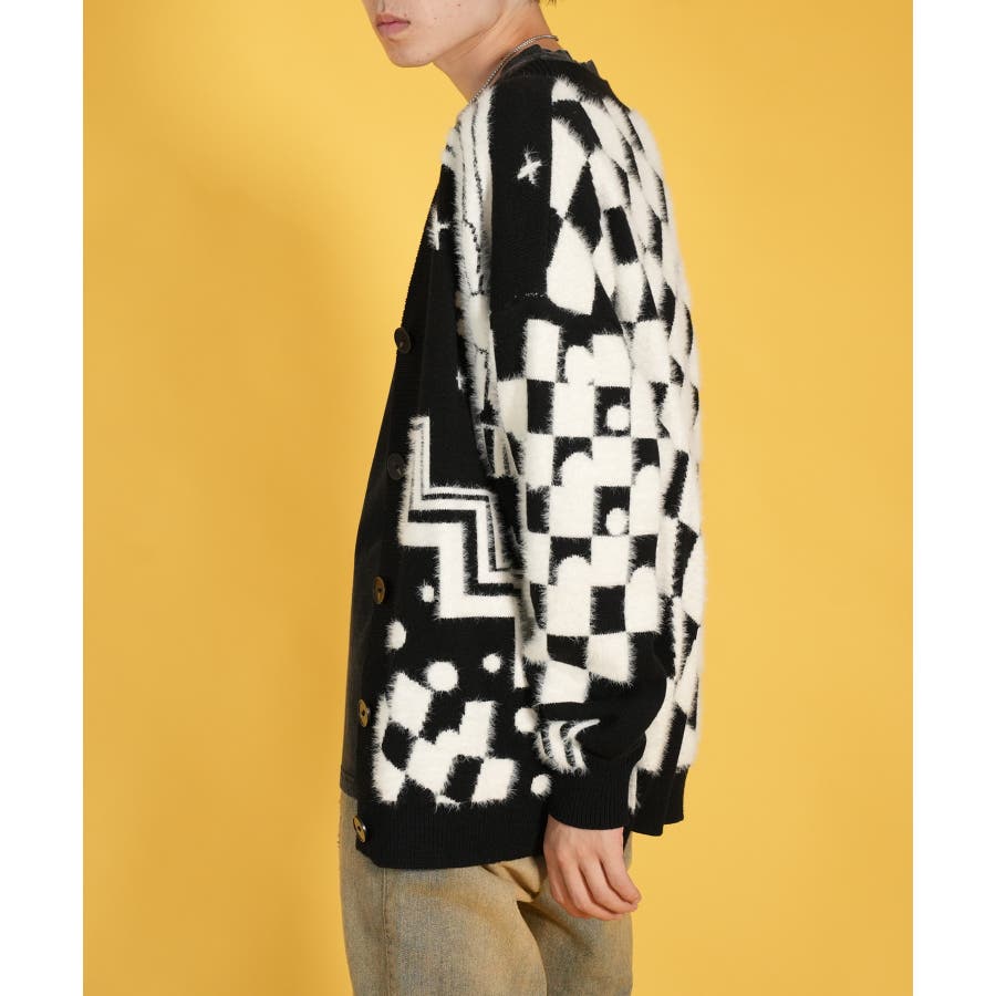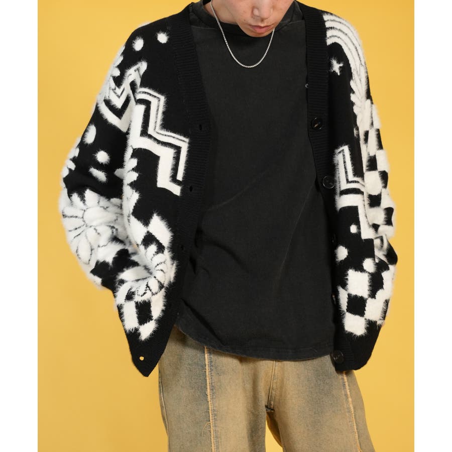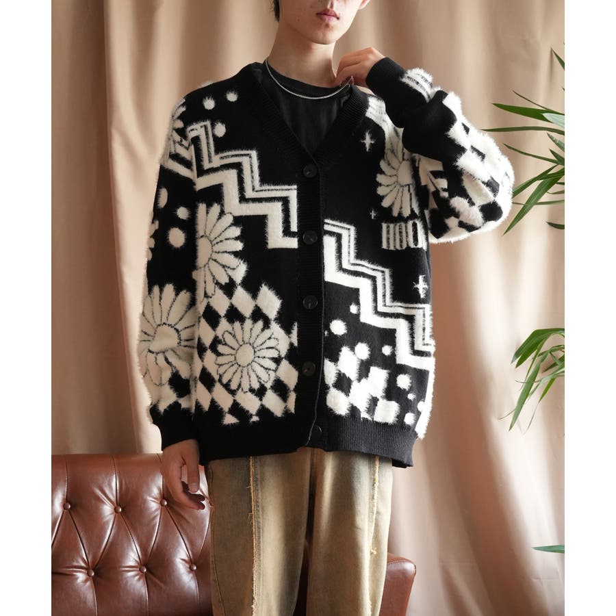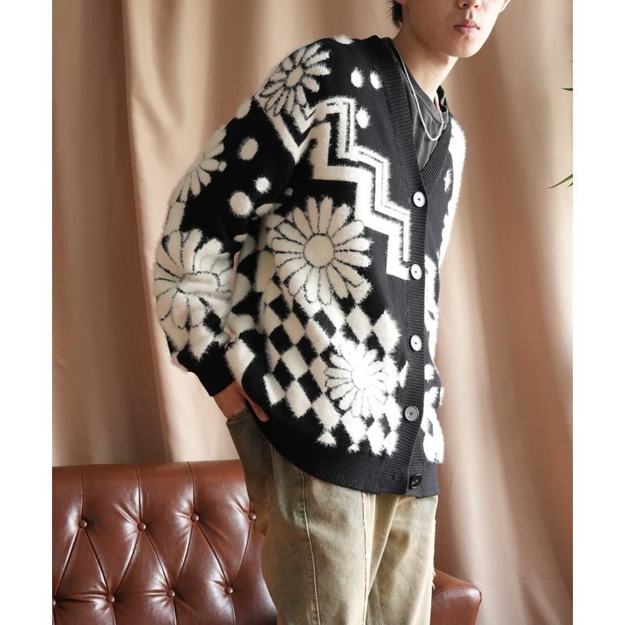 レトロな雰囲気漂う、幾何学模様部分シャギーニットカーディガン。