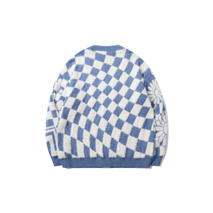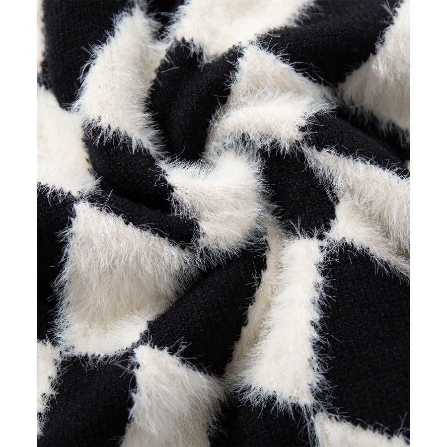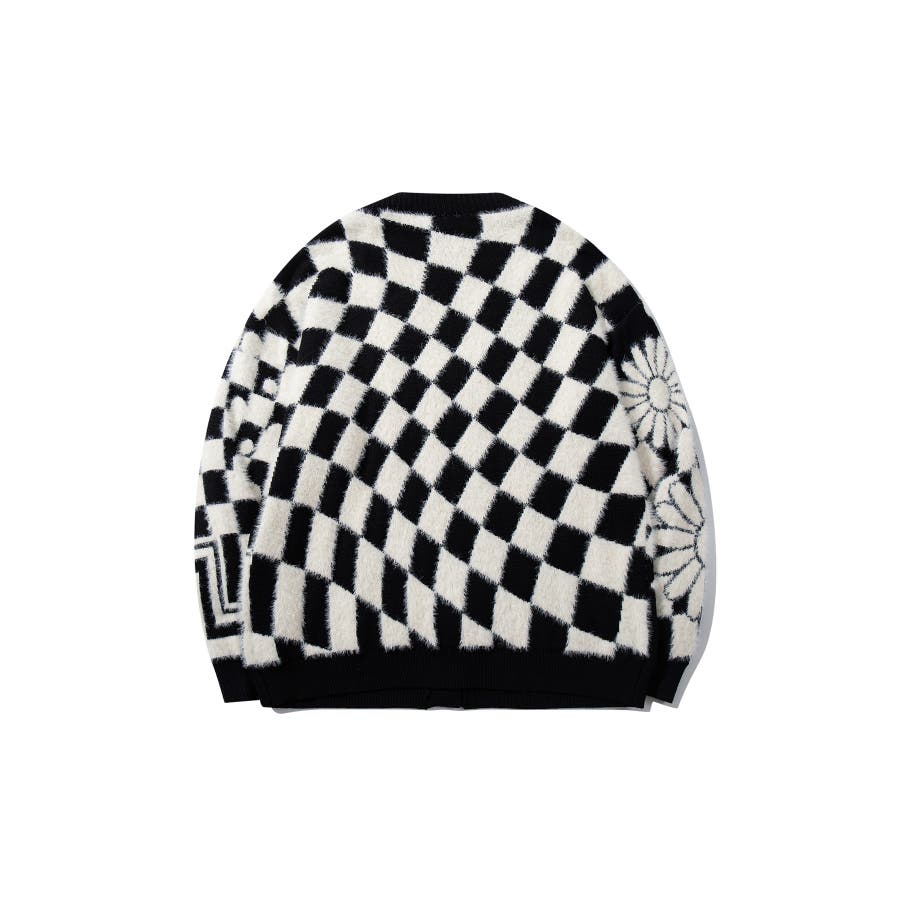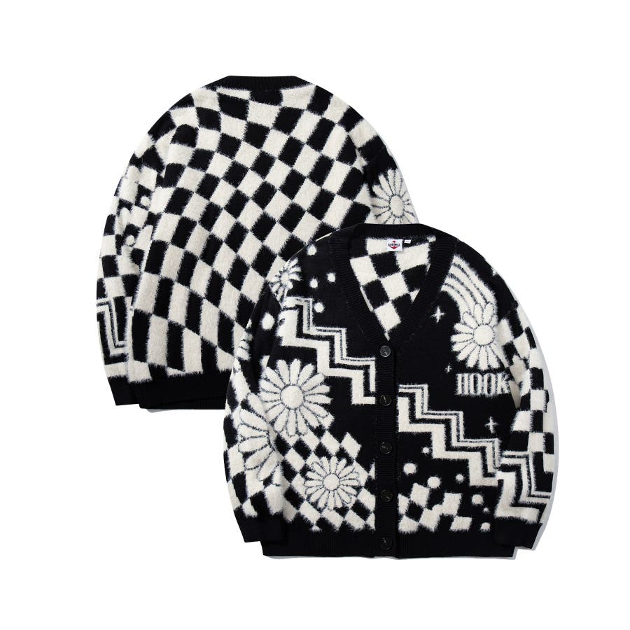 レトロな雰囲気漂う、幾何学模様部分シャギーニットカーディガン。
