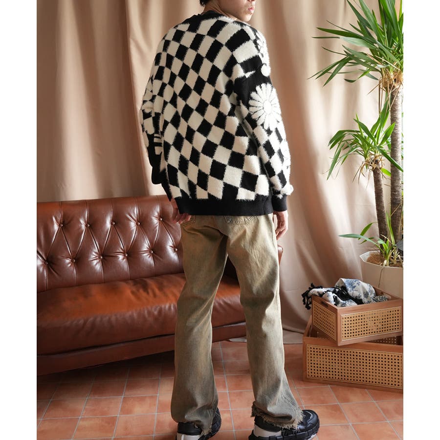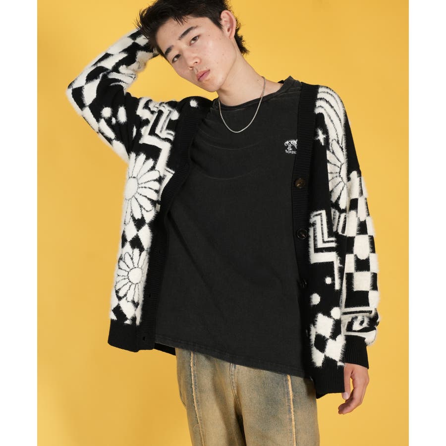 存在感のある幾何学模様と、部分的に施されたシャギーが、個性的な着こなしを演出。