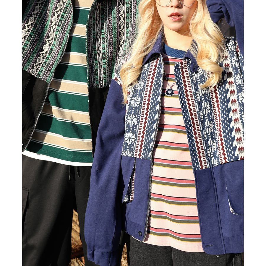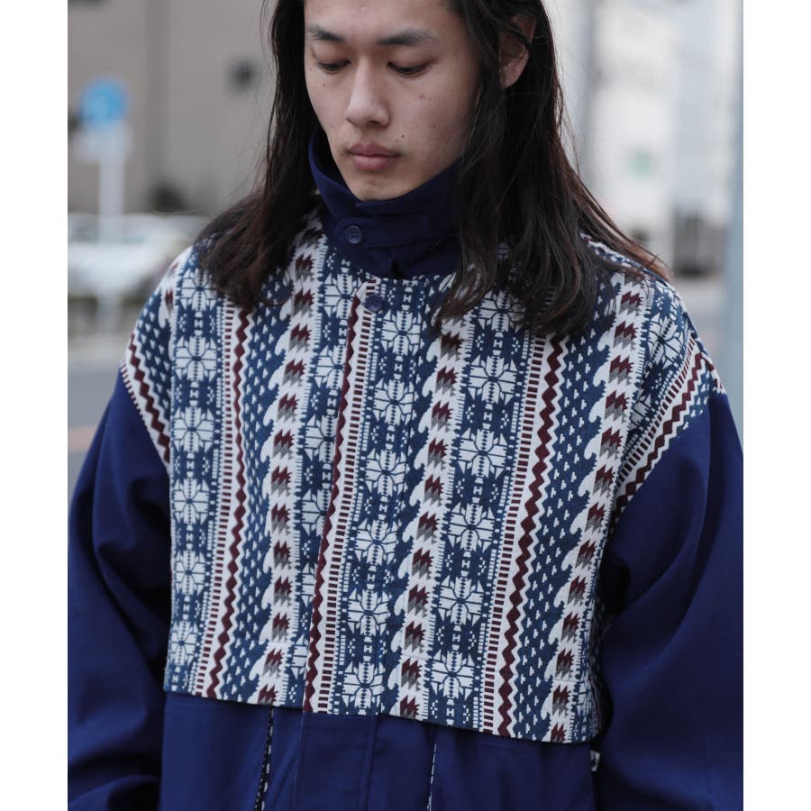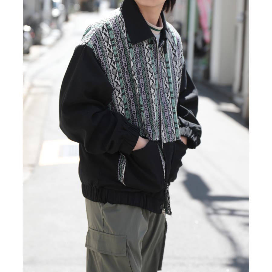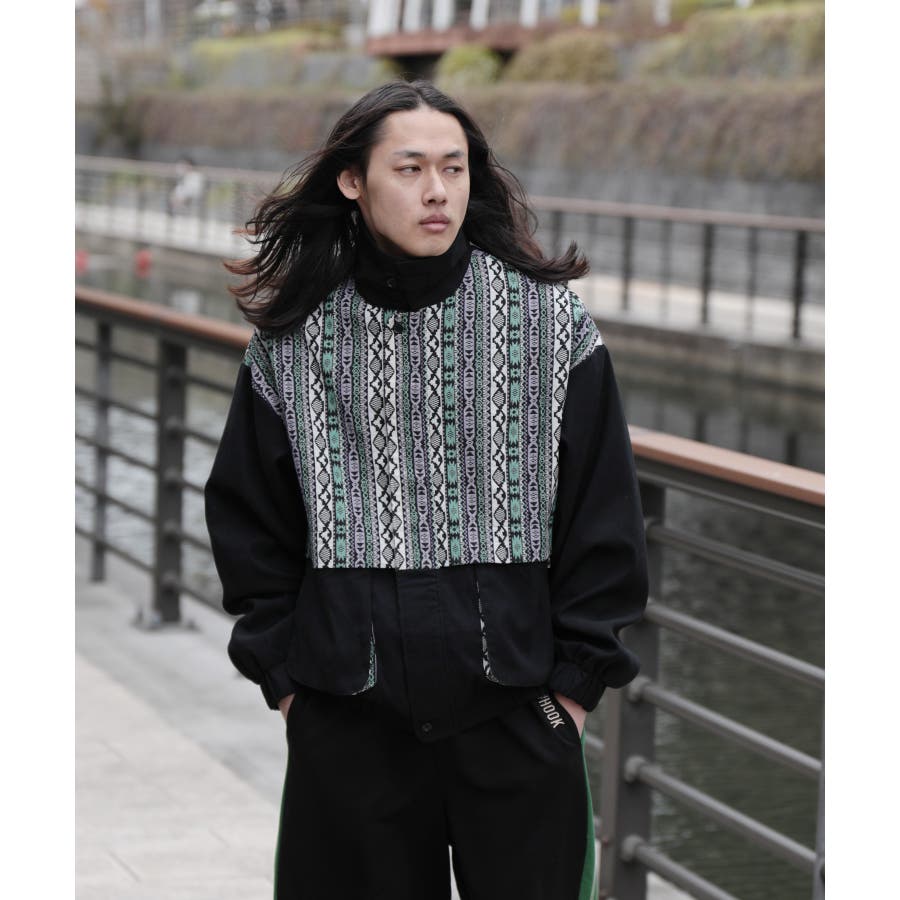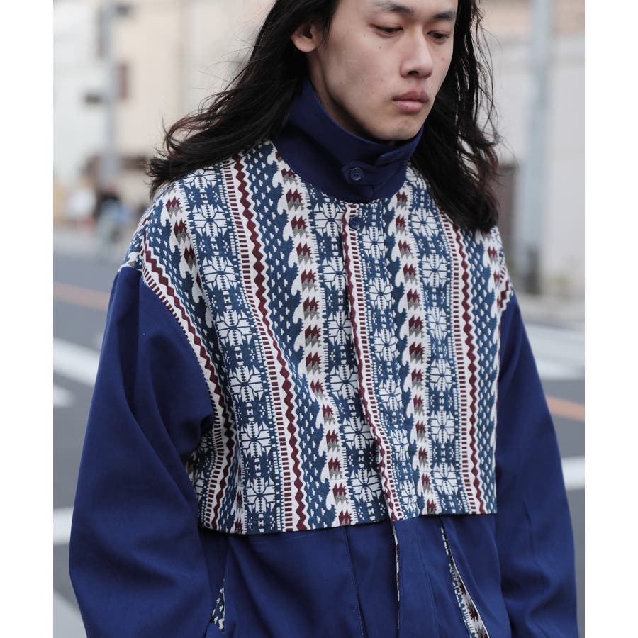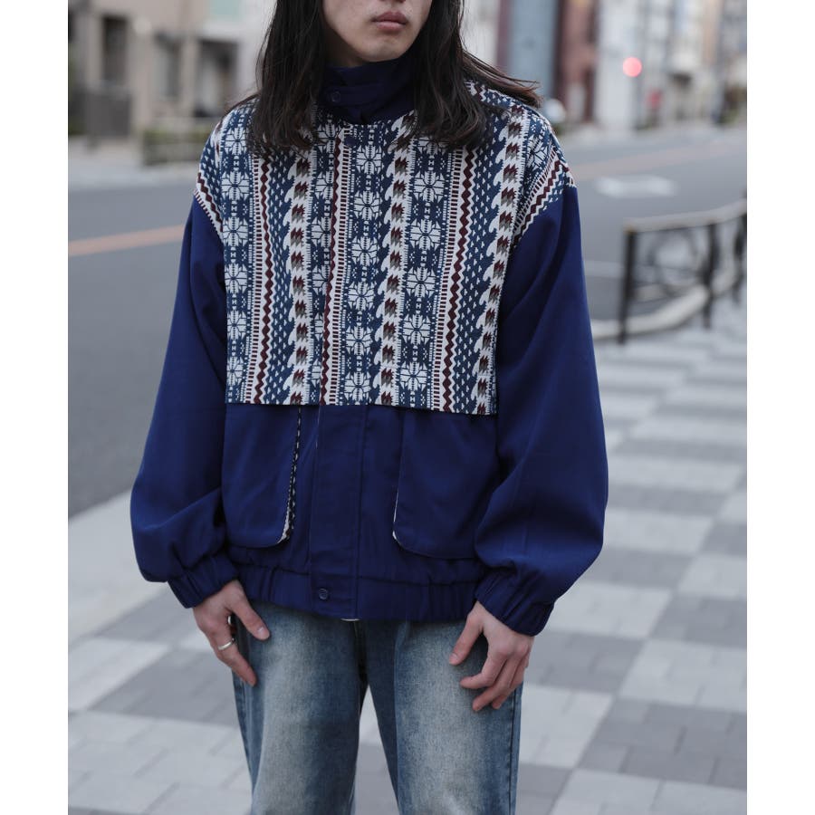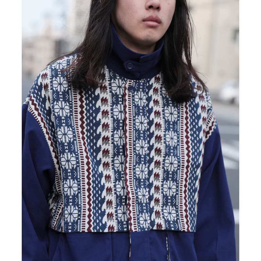 古着感覚の幾何学模様ジャカード切り替えコーチジャケット。ジャカードの部分はケープ風レイヤードデザインで、コーデのアクセントになります。無地の部分は触り心地よいのピッチスキン生地を使用し、防風性も抜群です。襟の部分は2WAYデザインで、スロートラッチをボタンで止めればハイネック仕様にもなれる機能性も抜群のブルゾンアイテム。ペアルック、リンクコーデ、カップルコーデにもおすすめ!! メンズ・レディース共にお勧めのユニセックスアイテムです。