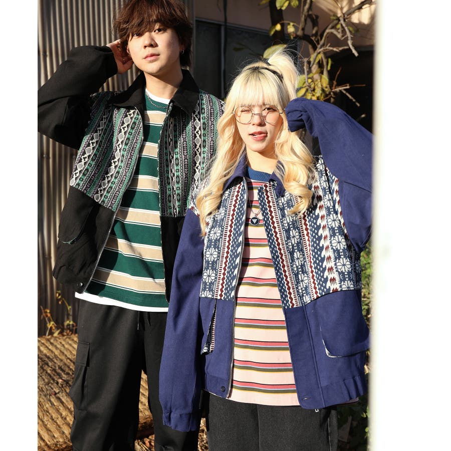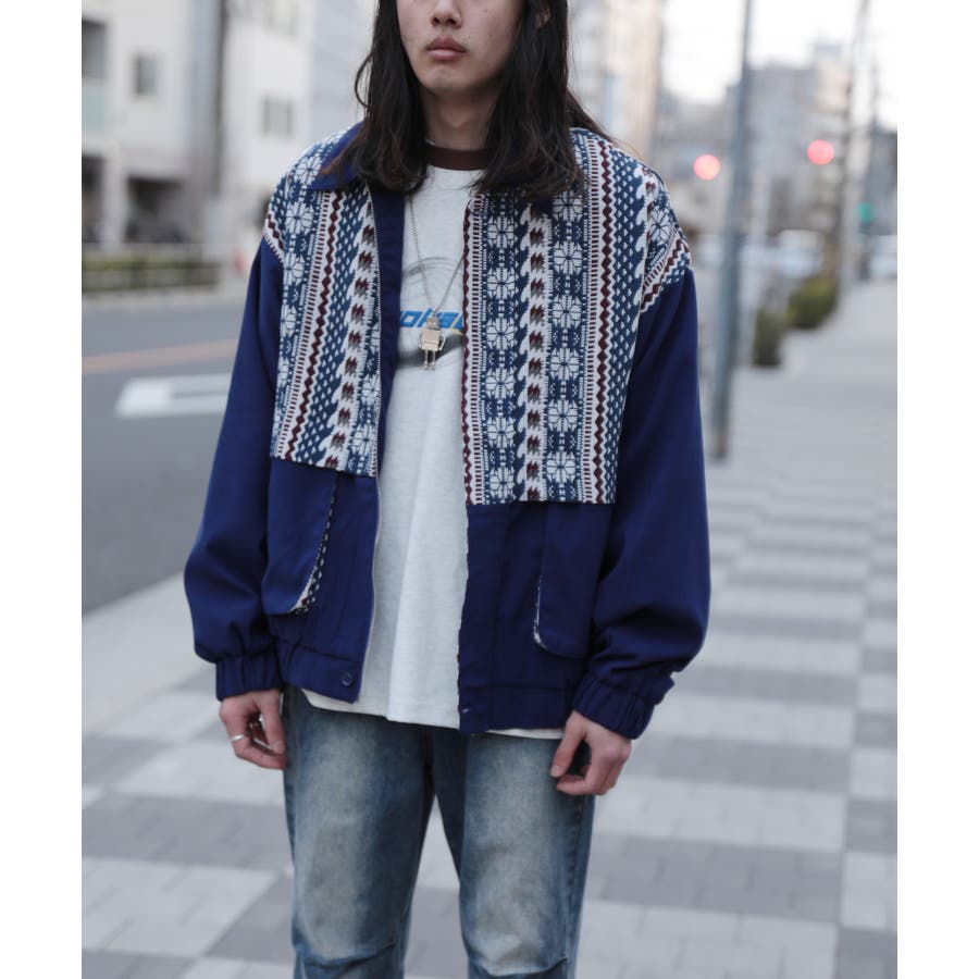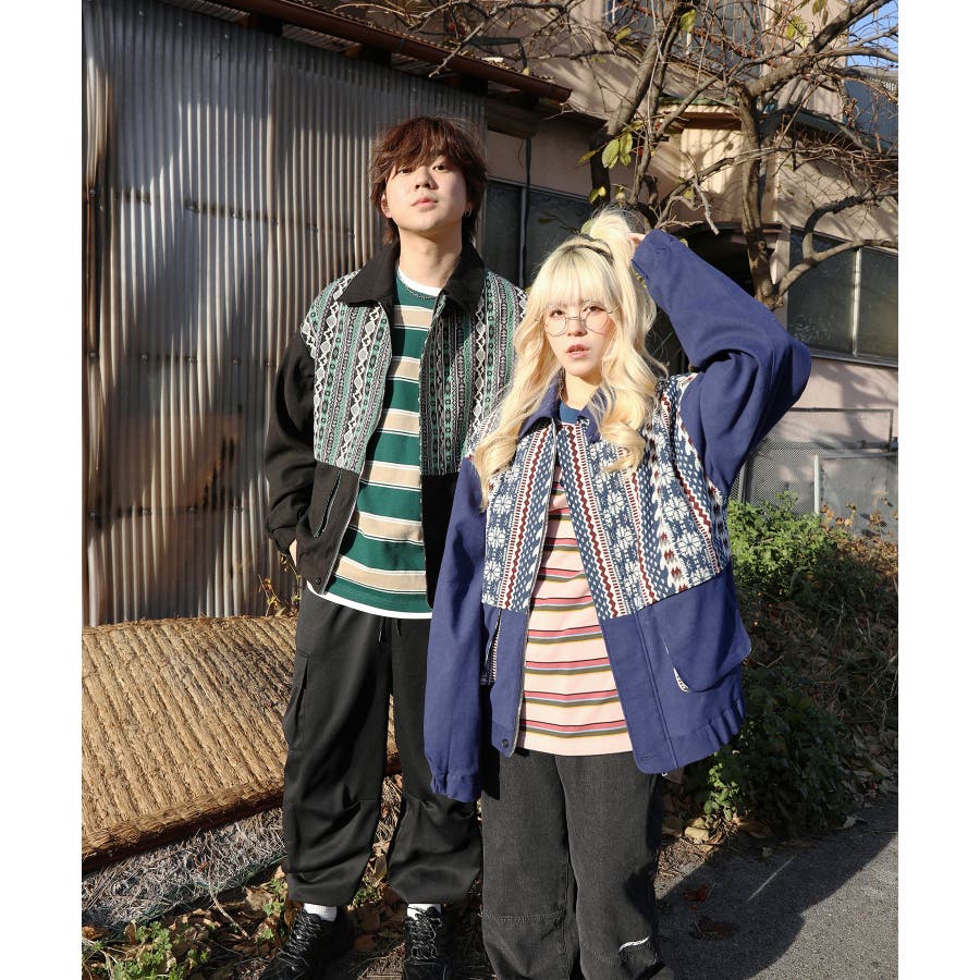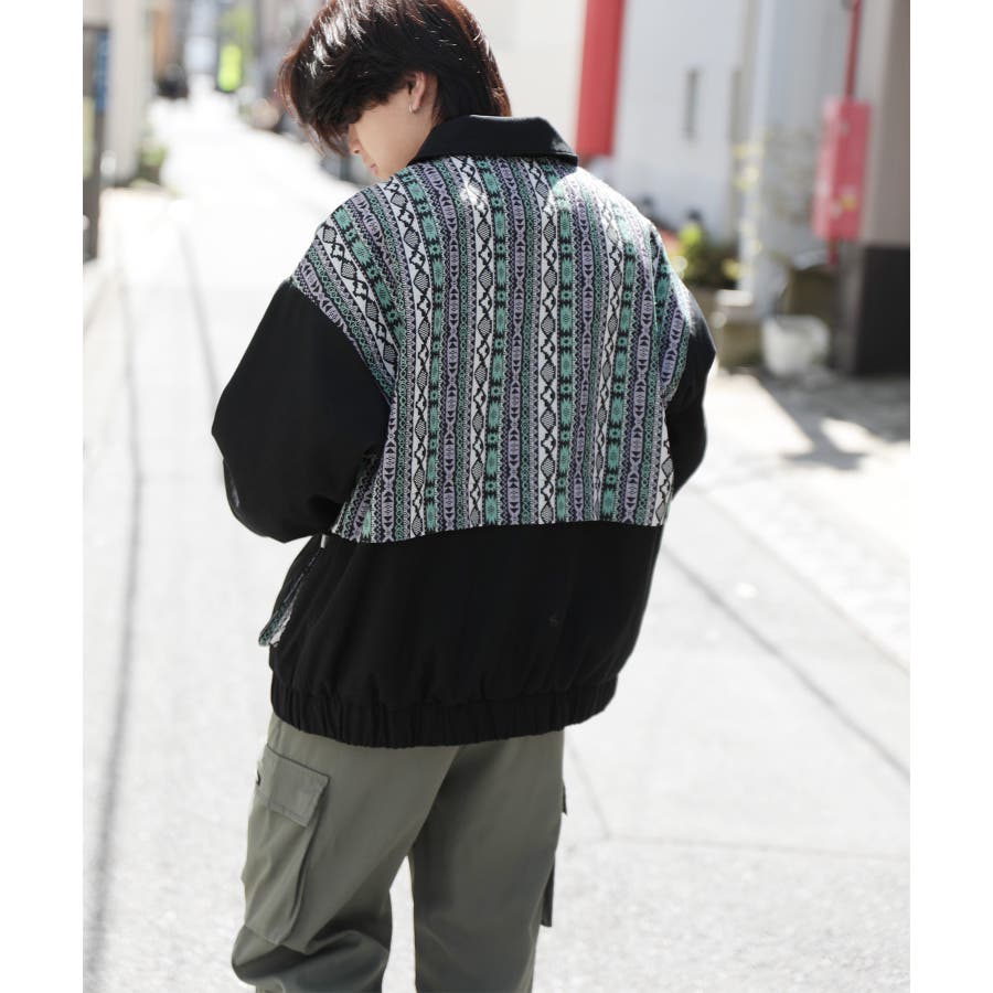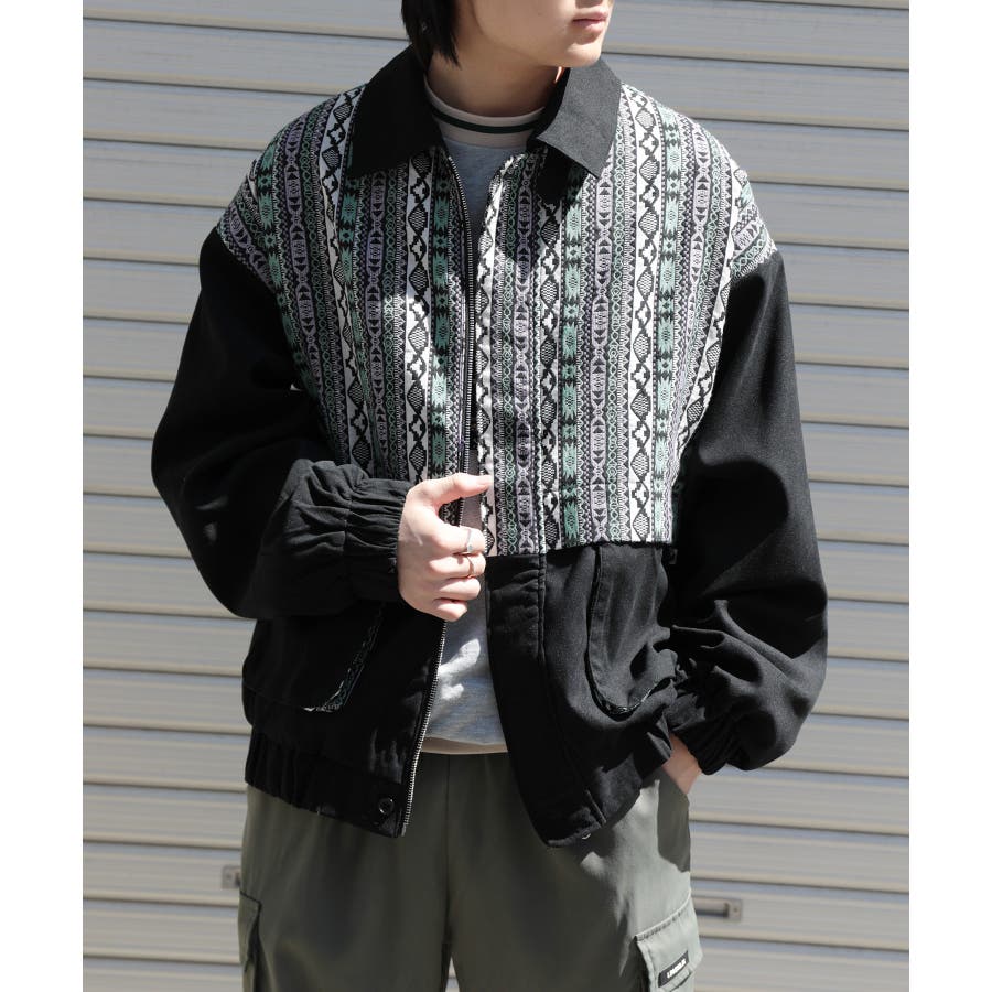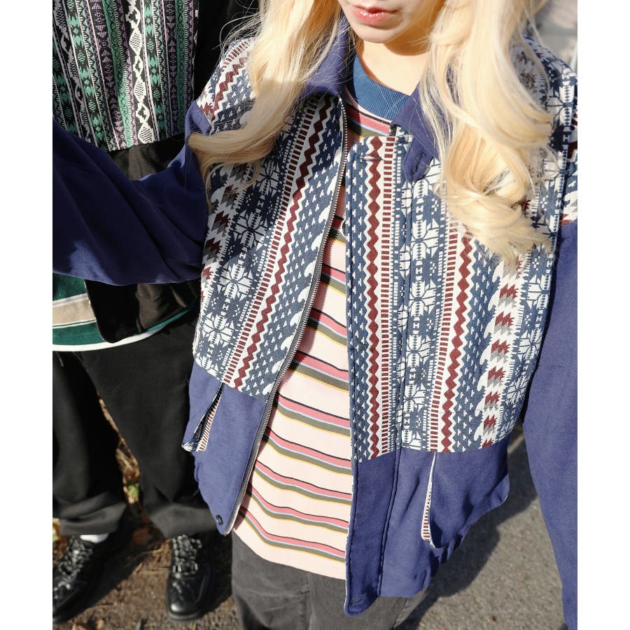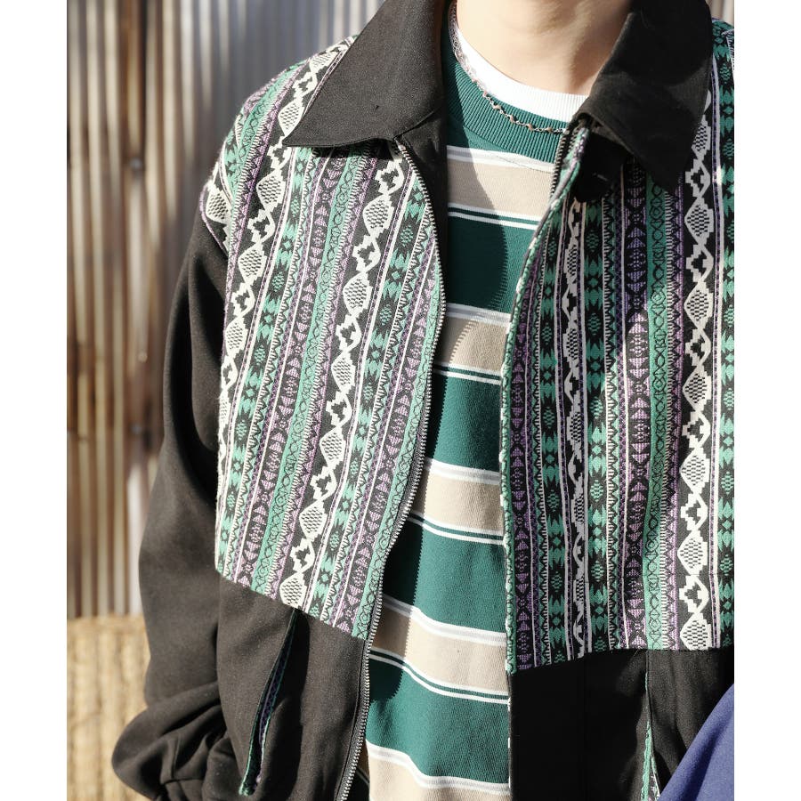 古着感覚の幾何学模様ジャカード切り替えコーチジャケット。ジャカードの部分はケープ風レイヤードデザインで、コーデのアクセントになります。無地の部分は触り心地よいのピッチスキン生地を使用し、防風性も抜群です。襟の部分は2WAYデザインで、スロートラッチをボタンで止めればハイネック仕様にもなれる機能性も抜群のブルゾンアイテム。ペアルック、リンクコーデ、カップルコーデにもおすすめ!! メンズ・レディース共にお勧めのユニセックスアイテムです。