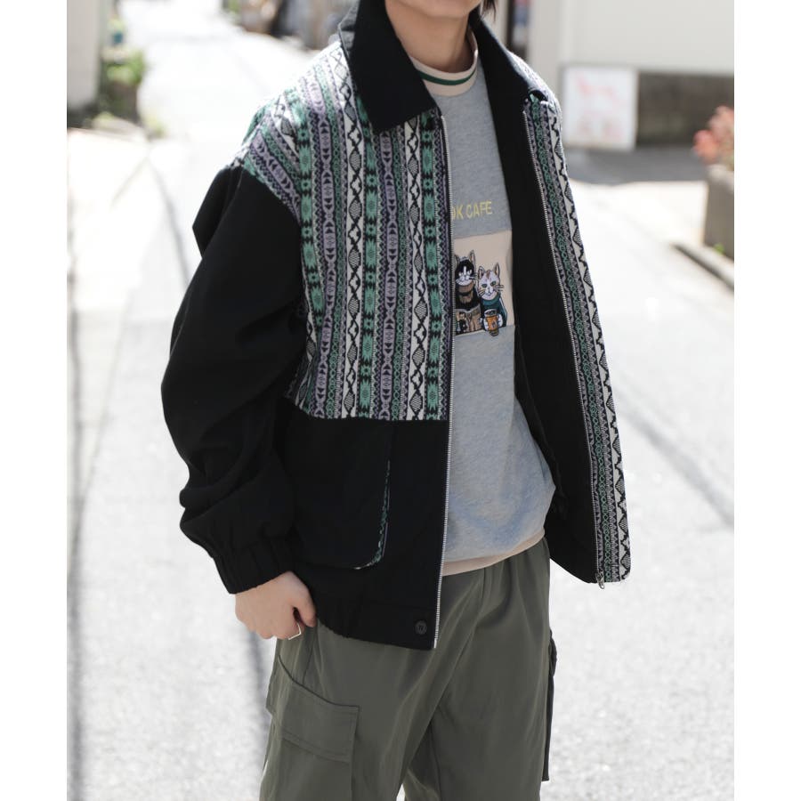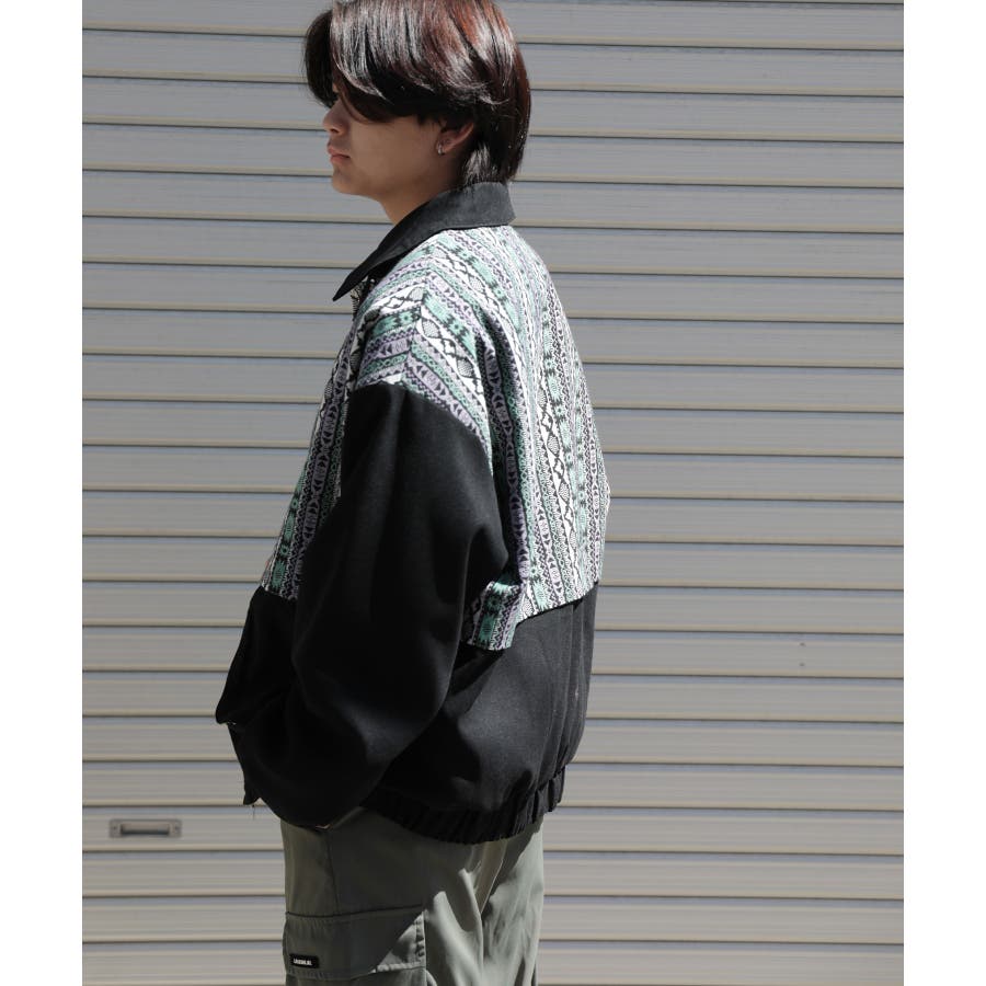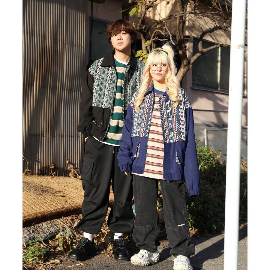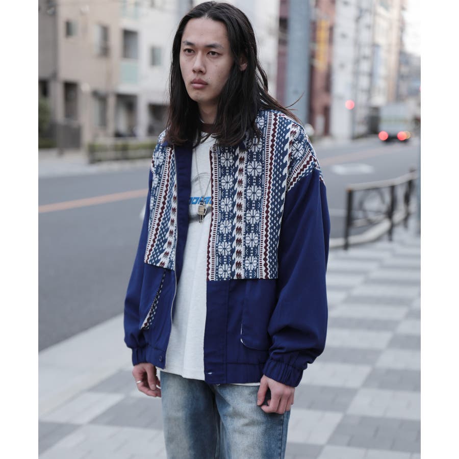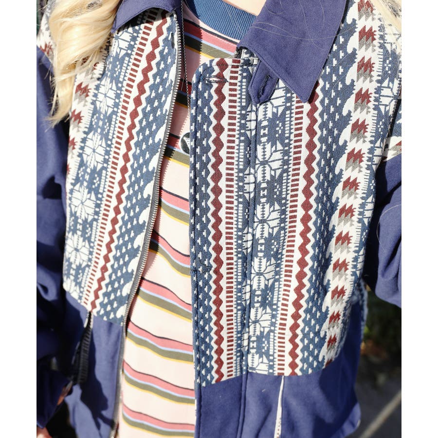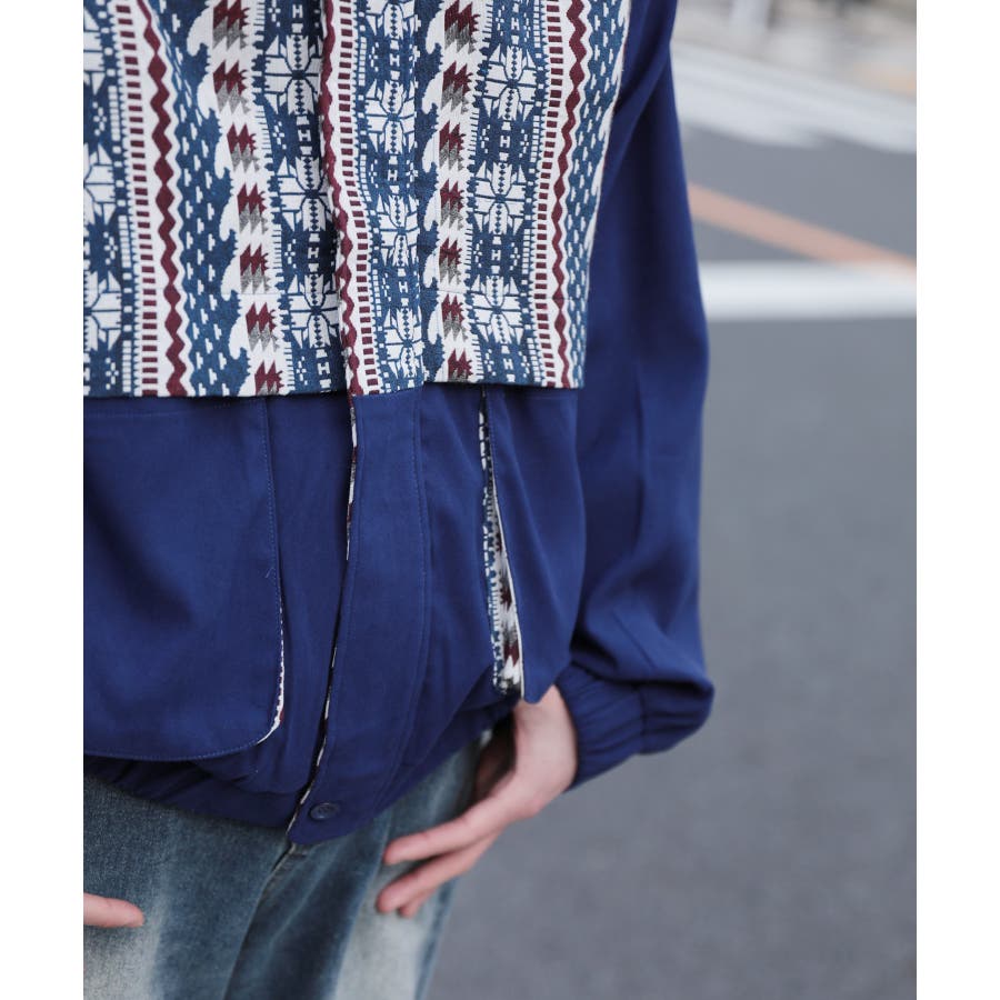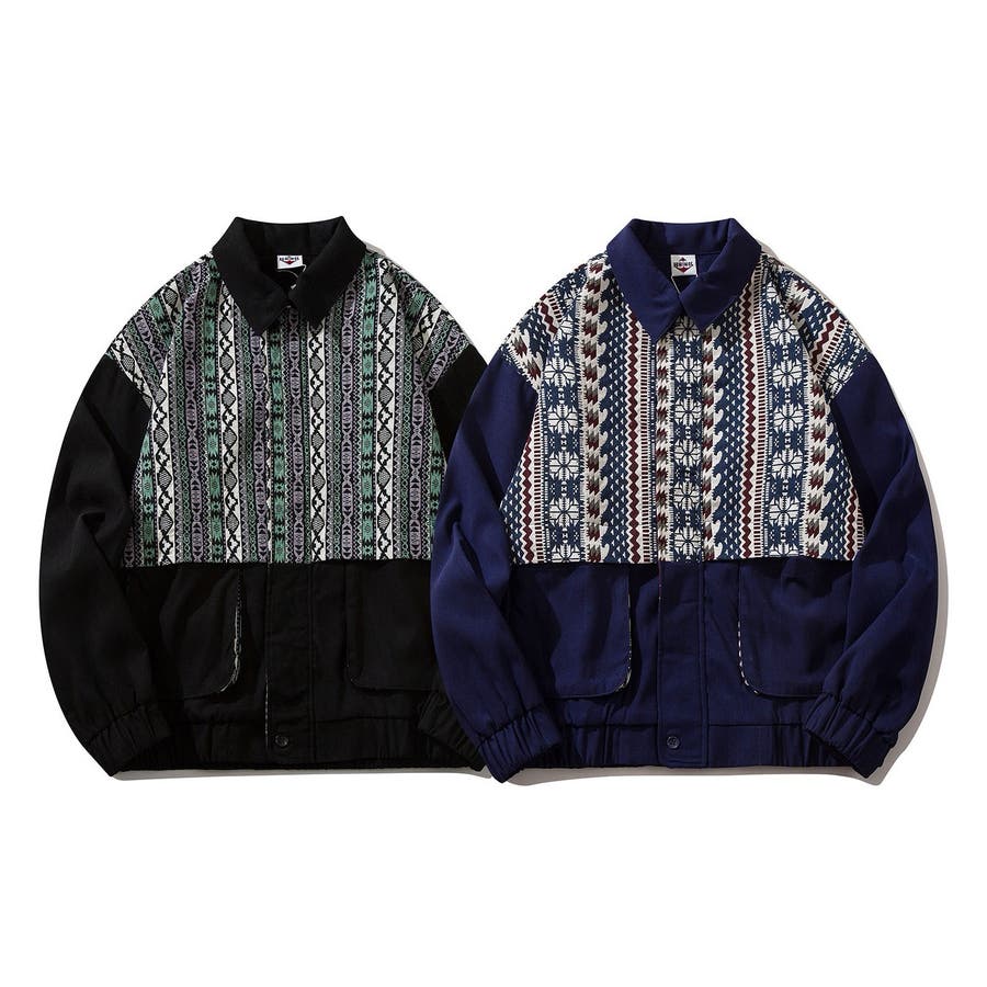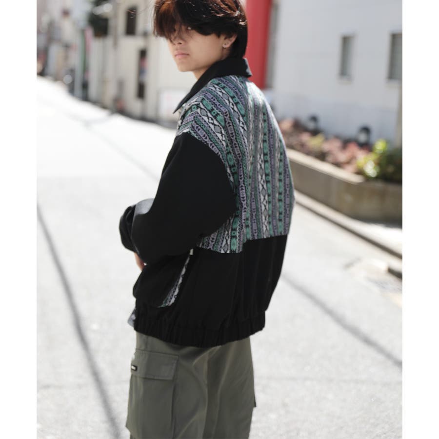 古着感覚の幾何学模様ジャカード切り替えコーチジャケット。ジャカードの部分はケープ風レイヤードデザインで、コーデのアクセントになります。無地の部分は触り心地よいのピッチスキン生地を使用し、防風性も抜群です。襟の部分は2WAYデザインで、スロートラッチをボタンで止めればハイネック仕様にもなれる機能性も抜群のブルゾンアイテム。ペアルック、リンクコーデ、カップルコーデにもおすすめ!! メンズ・レディース共にお勧めのユニセックスアイテムです。