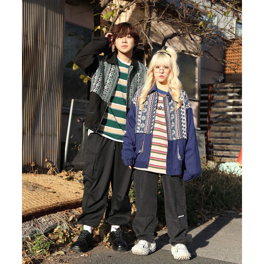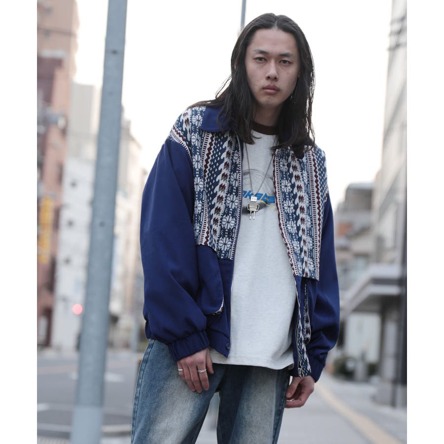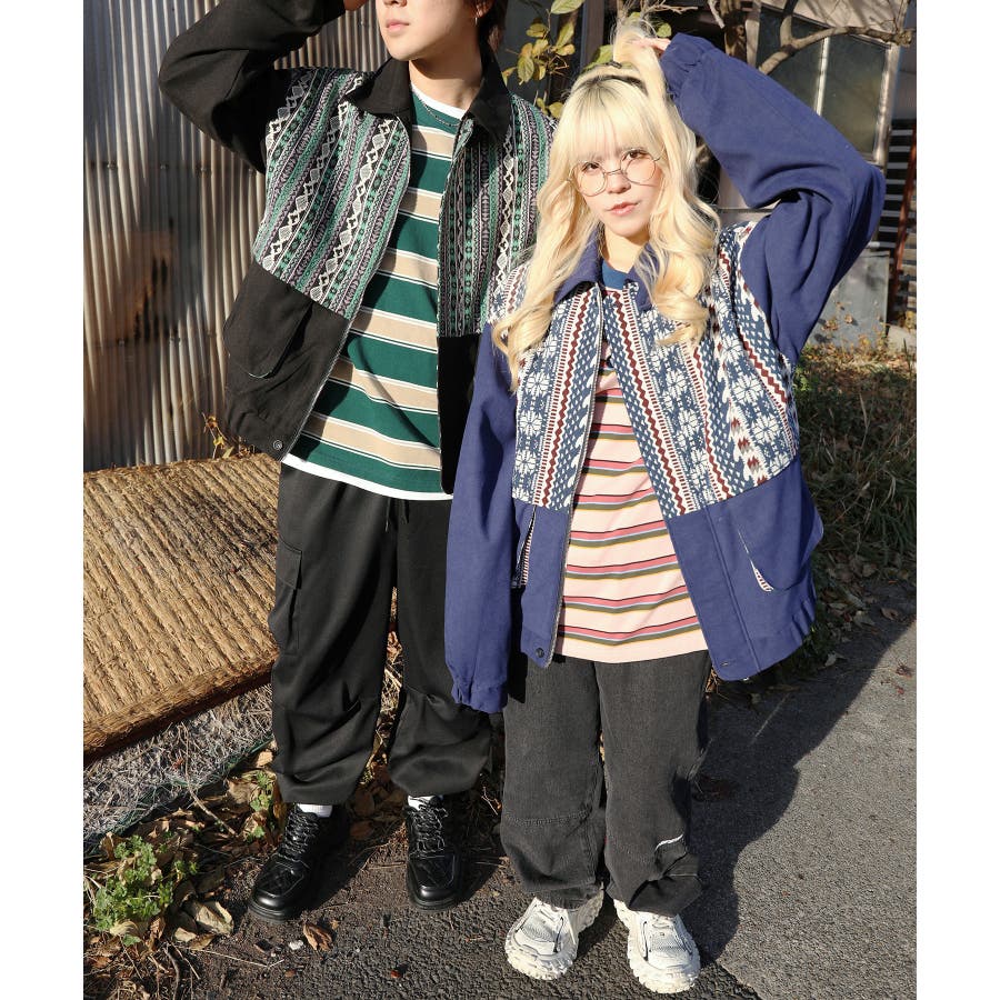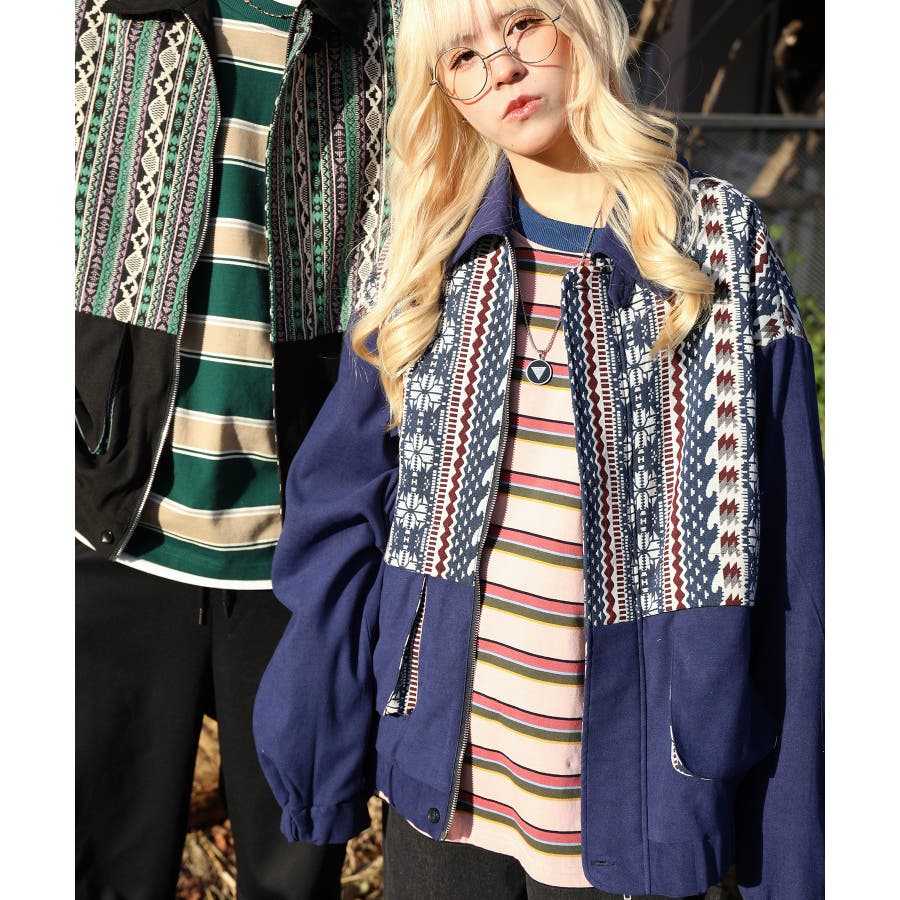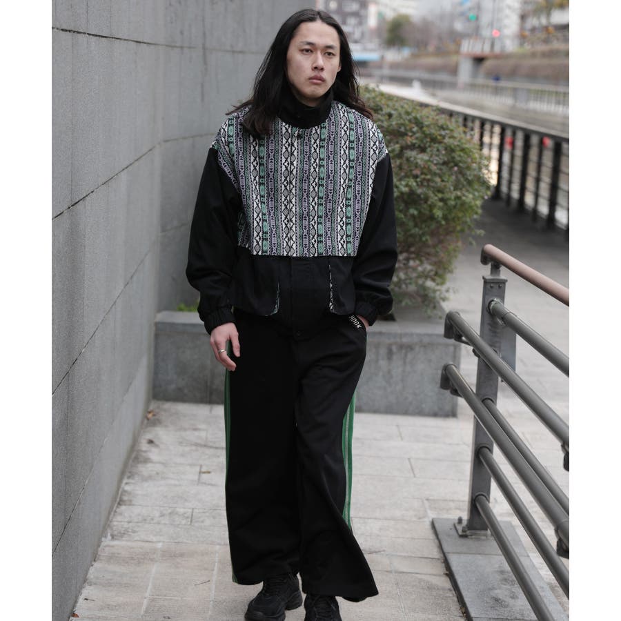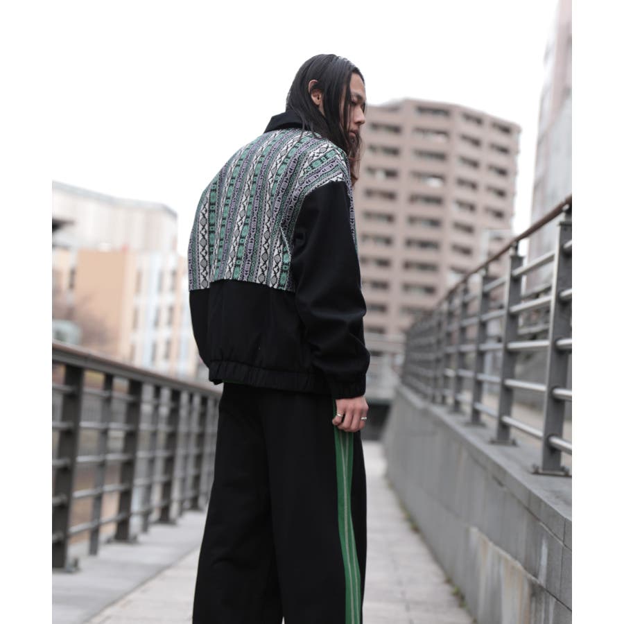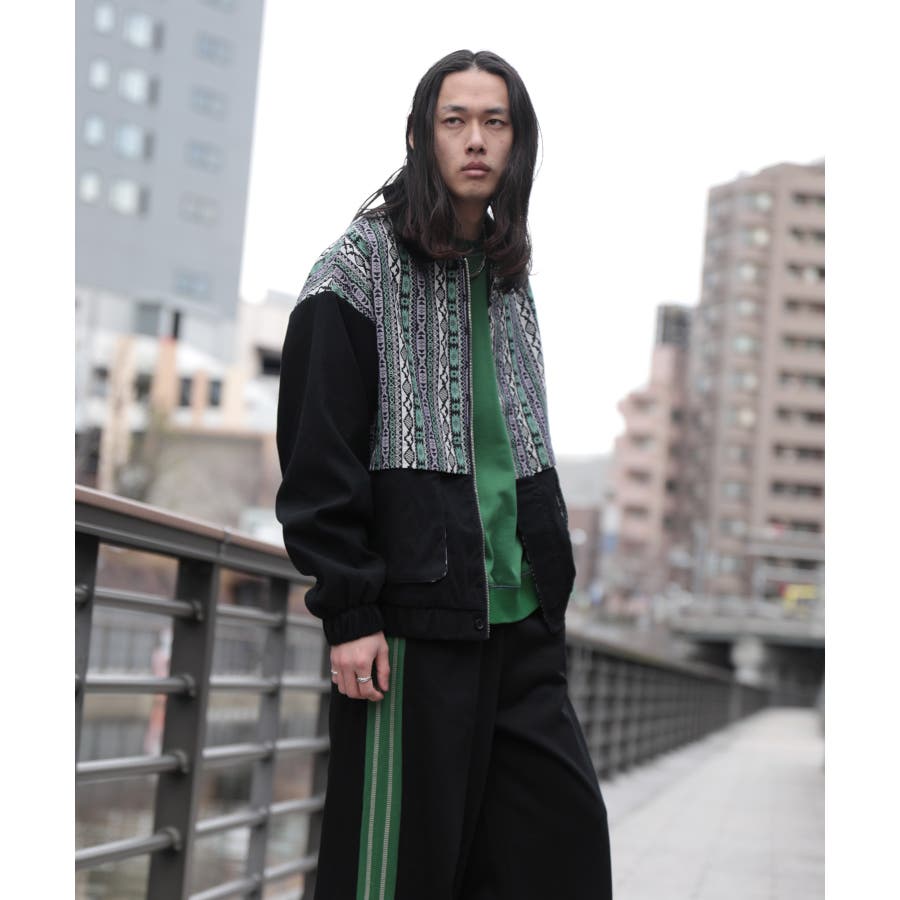古着感覚の幾何学模様ジャカード切り替えコーチジャケット。ジャカードの部分はケープ風レイヤードデザインで、コーデのアクセントになります。無地の部分は触り心地よいのピッチスキン生地を使用し、防風性も抜群です。襟の部分は2WAYデザインで、スロートラッチをボタンで止めればハイネック仕様にもなれる機能性も抜群のブルゾンアイテム。ペアルック、リンクコーデ、カップルコーデにもおすすめ!! メンズ・レディース共にお勧めのユニセックスアイテムです。