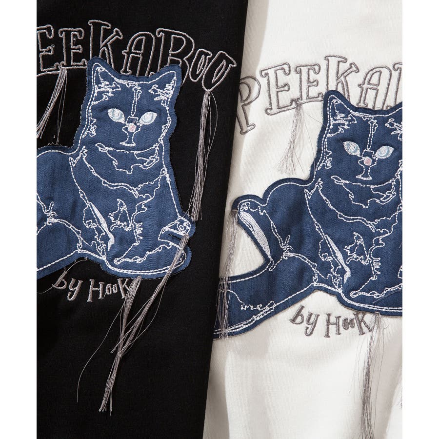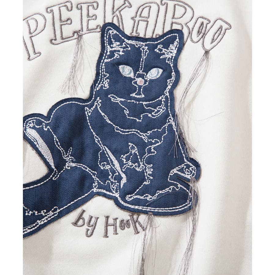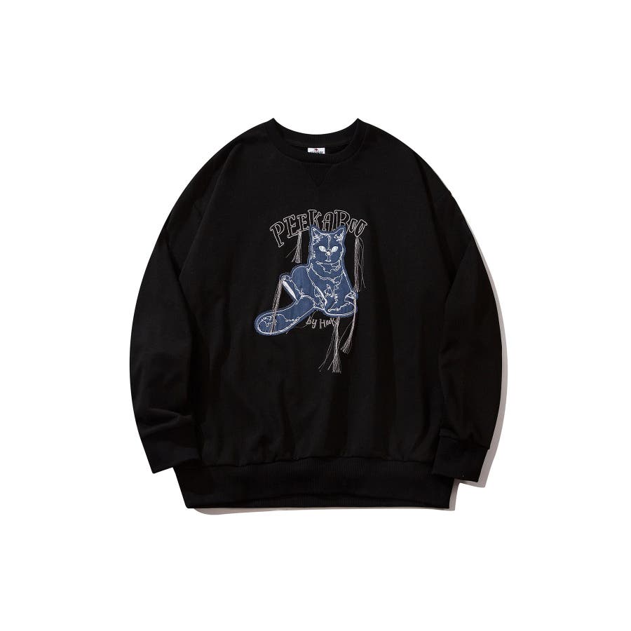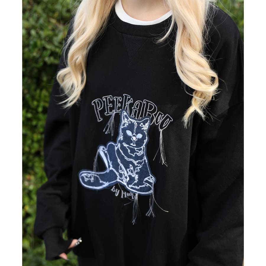 HOOK -original- かわいいネコパッチワーク刺繍フリンジスウェット