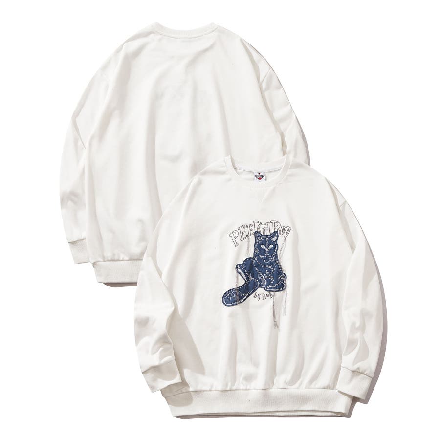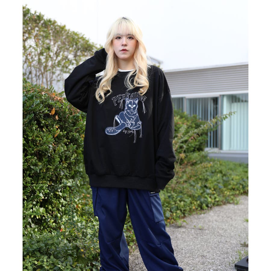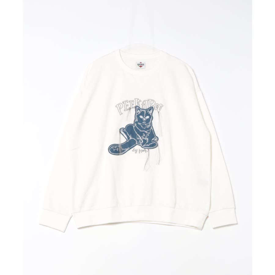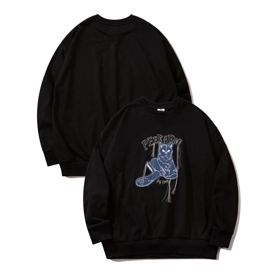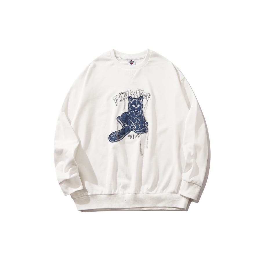 HOOK -original- かわいいネコパッチワーク刺繍フリンジスウェット