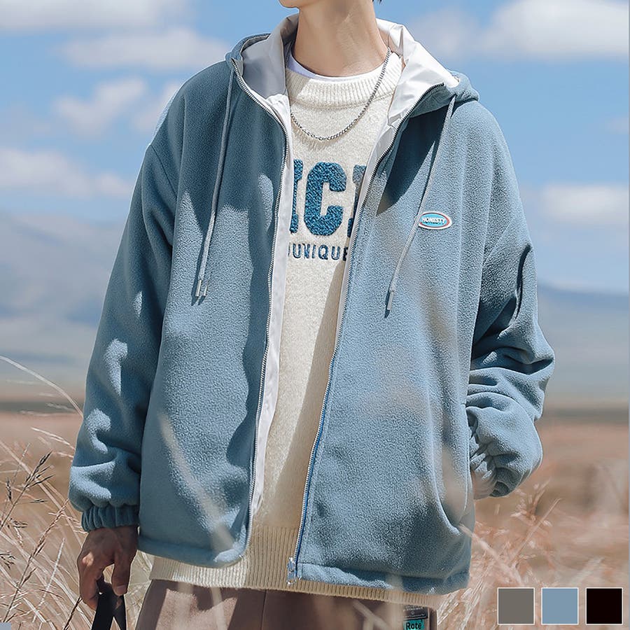 ハリのあるポリエステル素材と、柔らかなボア素材は配色になっているリバーシブルパーカー。