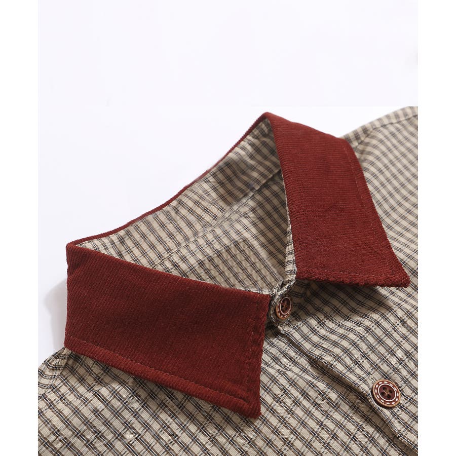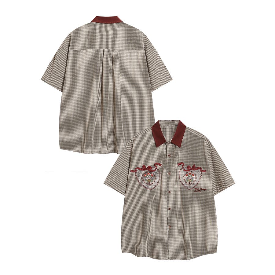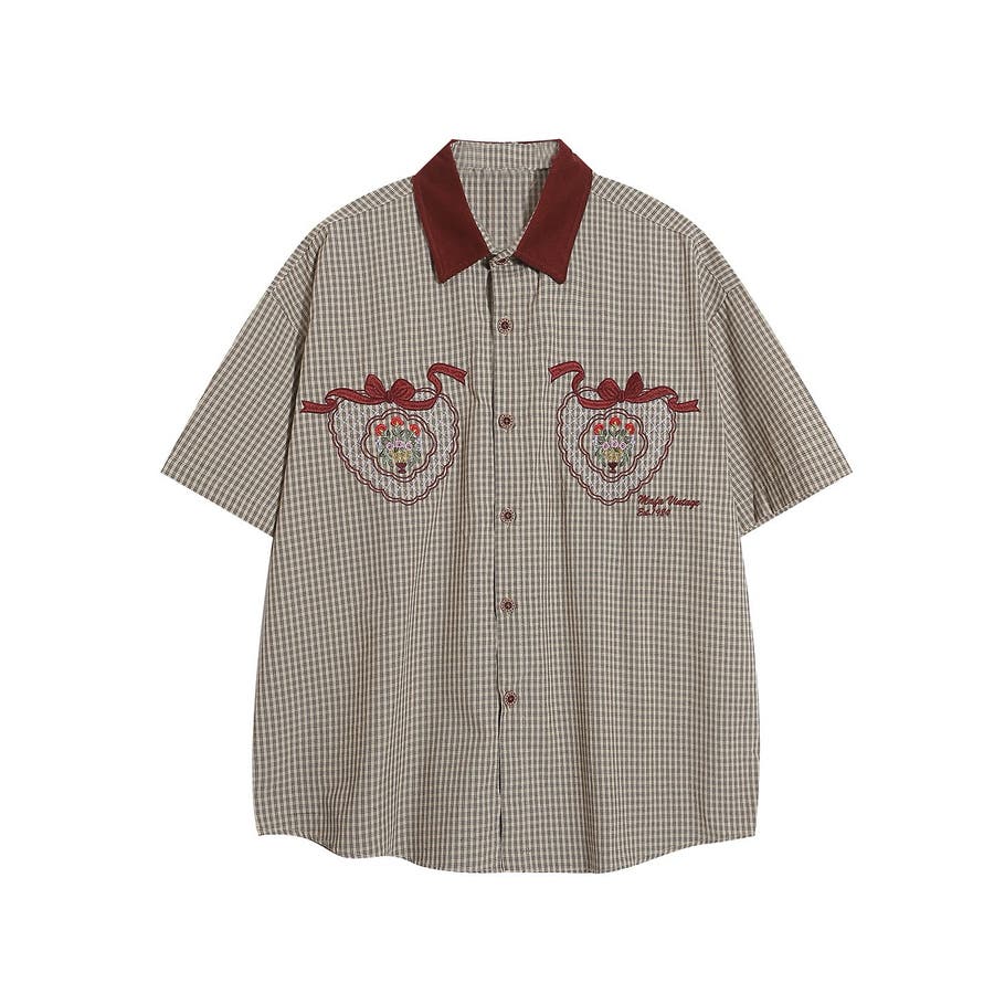 異素材コーデュロイの配色襟が個性的な刺繍入り半袖シャツヴィンテージ風のチェック柄生地がレトロでオシャレな一枚オーバーサイズでメンズライクなデザイン胸元にフェミニンなブーケやリボンの刺繍入りでコーデのアクセントに一枚で着てもボタンを開けて羽織ってもOK