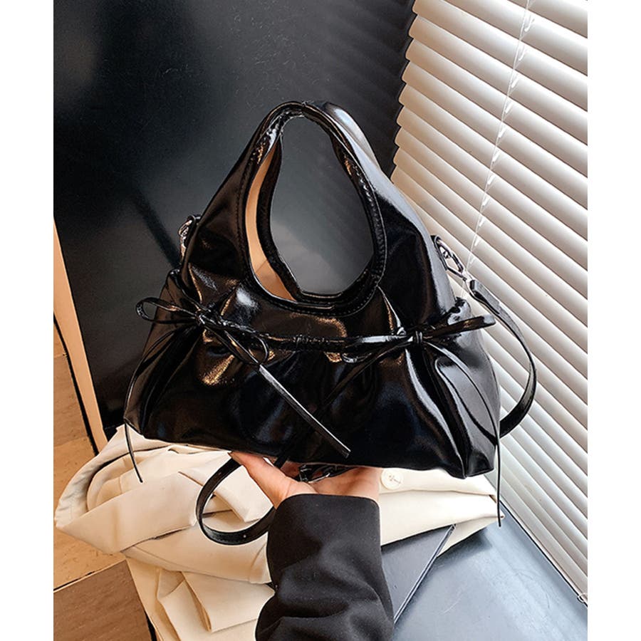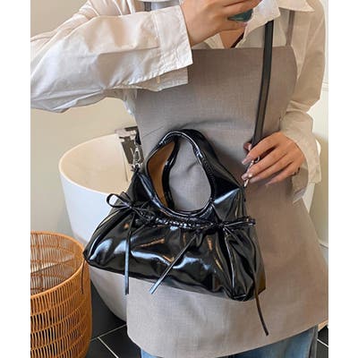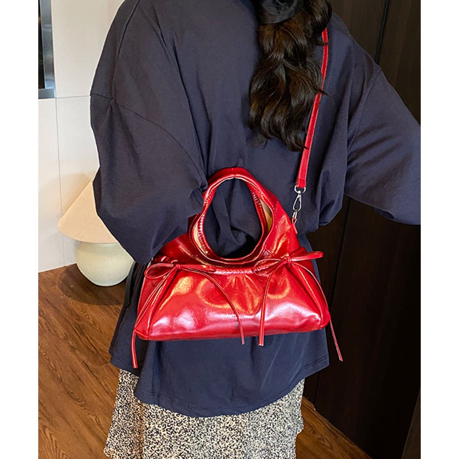 艶感のあるフェイクレザー素材が高見えしつつ、柔らかい質感で持ちやすさも◎。
