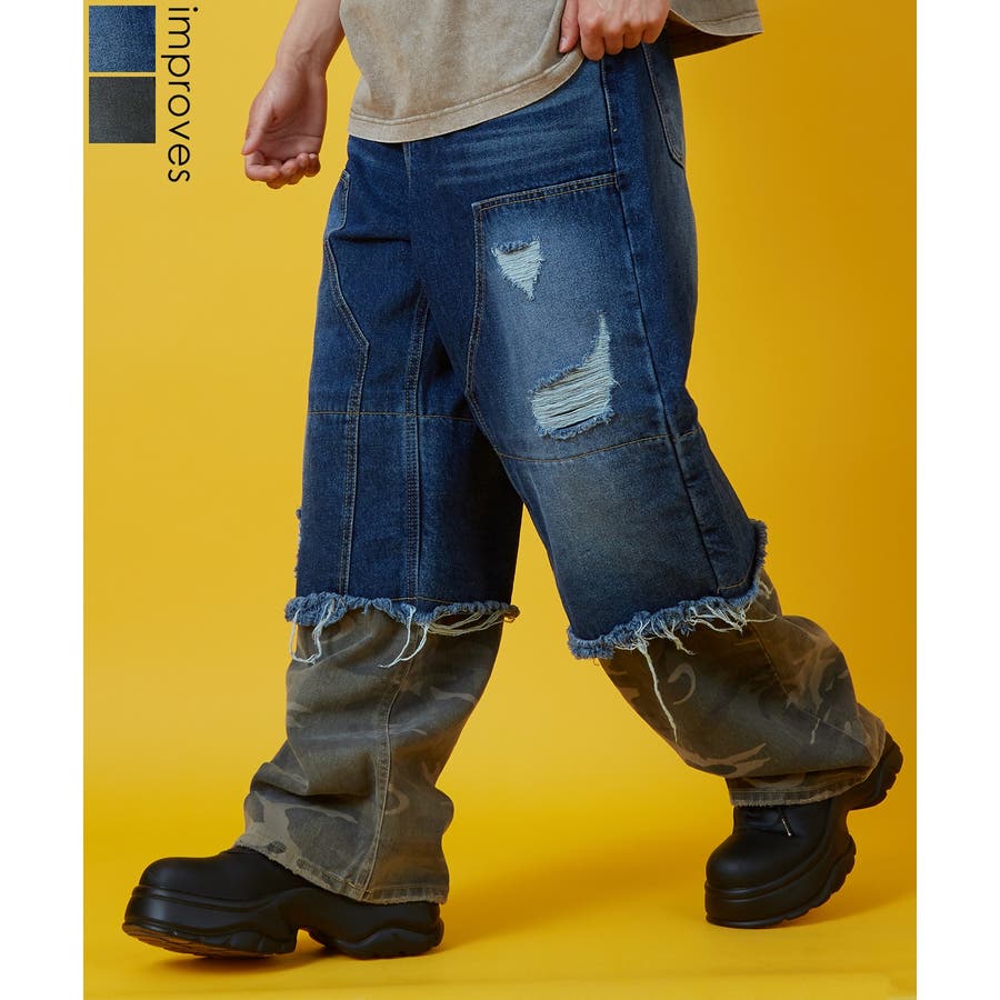 USED感のあるデニムに加え、ひざ下にはカモフラ柄をドッキング。ダブルニー仕様の切り替えとクラッシュ加工が、無骨なストリート感を演出します。裾は断ち切りのフリンジ仕様で、動きのあるシルエットが魅力。