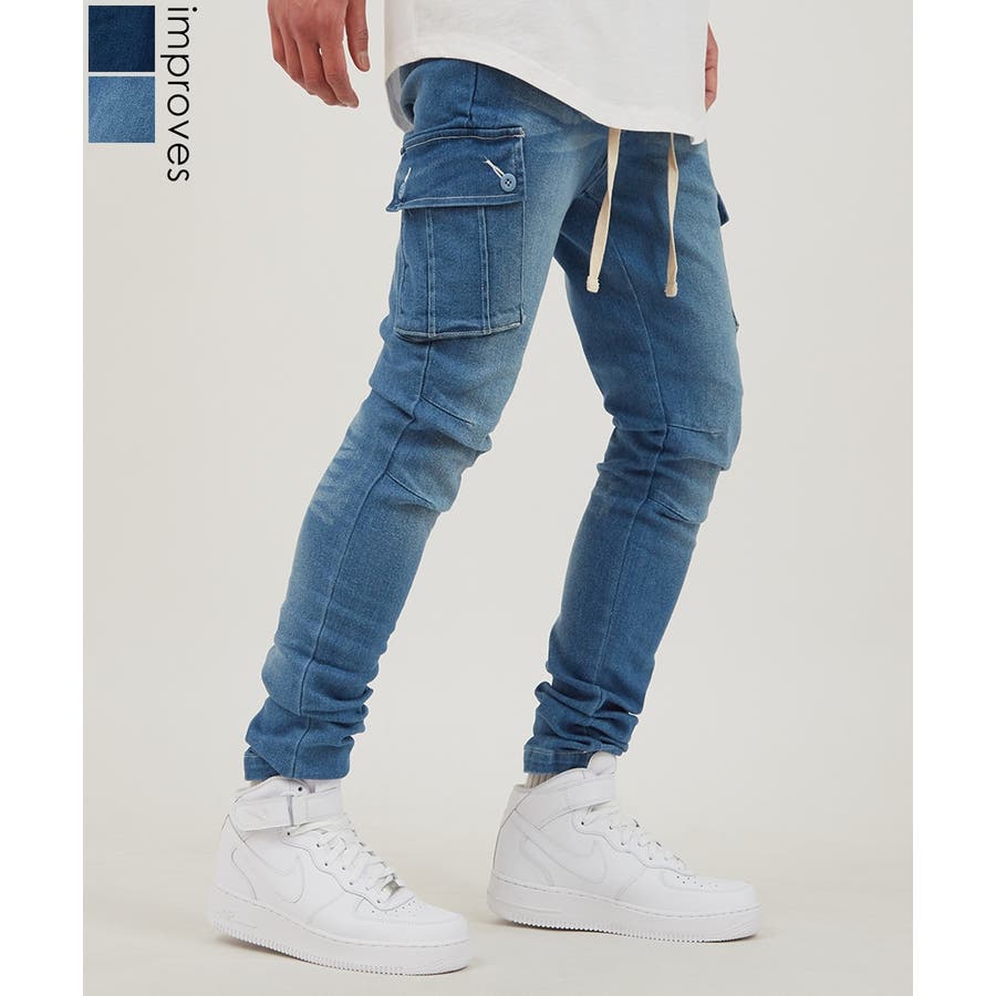 無骨なミリタリーイメージをテーパードシルエットとスリムフィットのサイジングで今風にアレンジしたデニムカーゴパンツです。 ストレッチの効いた細身のサイジングを採用し、野暮ったく見える事のないスマートなシルエット。 ストリートやカジュアルコーデにピッタリで、韓国、韓流ファッション的な着こなしにもオススメな一品。