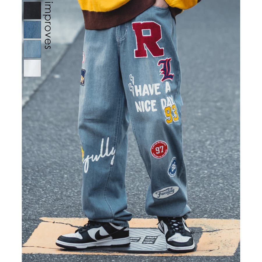 古着ライクなワッペン使いやプリント加工が個性的なパンツです。