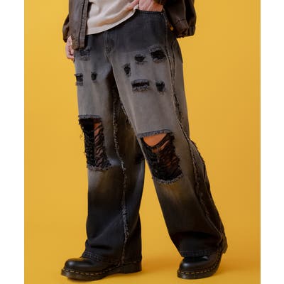 ハードな加工感が目を引くワイドデニム。