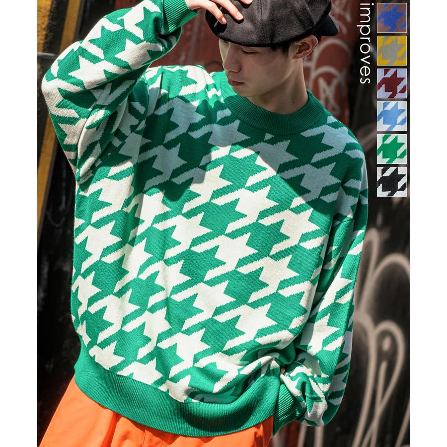 トラッドなアイテムの定番パターンのハウンドトゥースチェック柄にエッジの効いた配色が目を引くオリジナルニットセーターが登場。