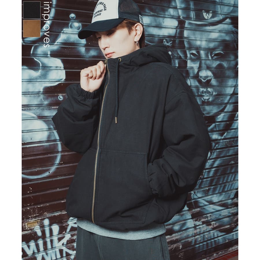 タフな生地感と裏ボア&中綿の暖かいワークテイストのフーデッドジャケット。