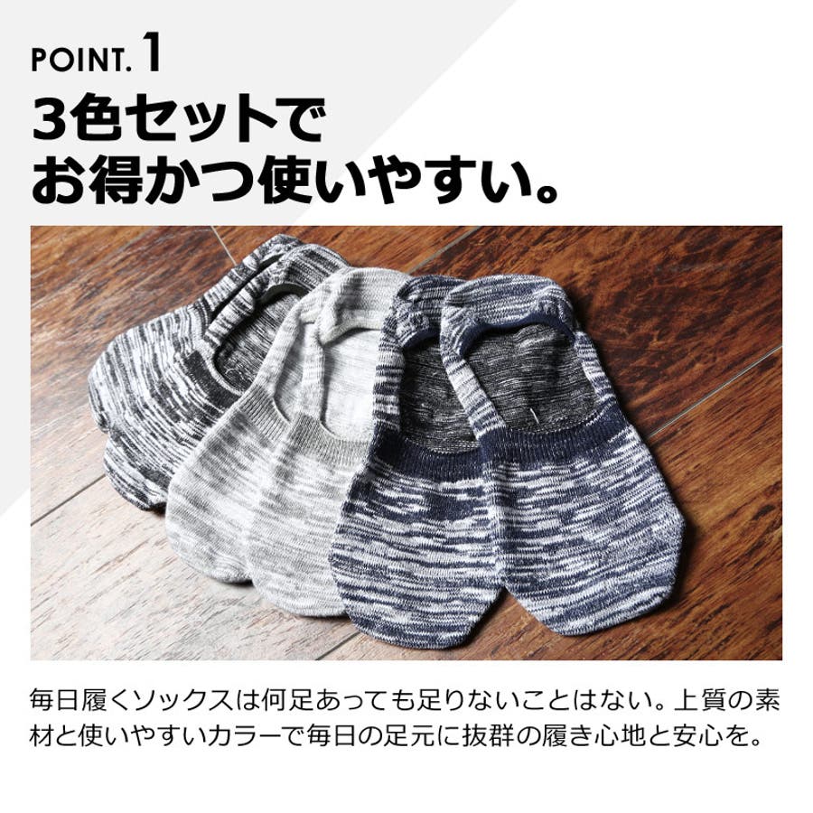 三足セットフットカバーのご紹介です。アンクル丈でスニーカーとの相性抜群のソックスがお得な三枚セットで登場。こなれた雰囲気を作り出してくれる杢調カラーが魅力的です。
