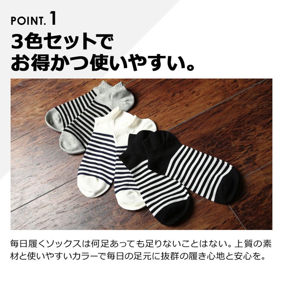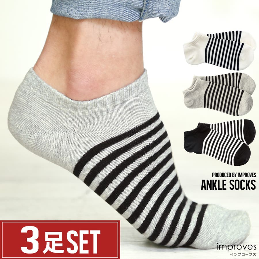 三足セットストライプアンクルソックスのご紹介です。スニーカーとの相性が抜群のストライプがアクセントカラー展開もモノトーンでどんな場面でも使えるブラック、ホワイト、チャコール。使いまわしの効くアイテムです。