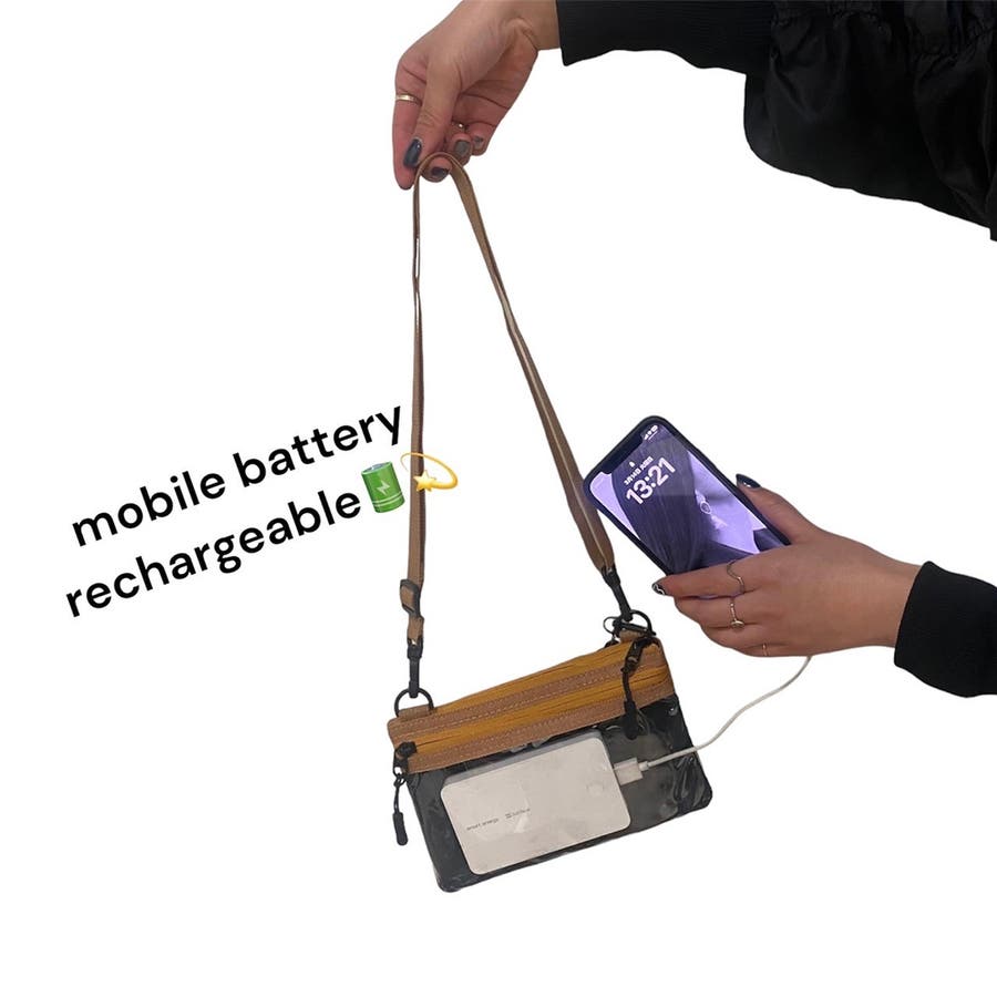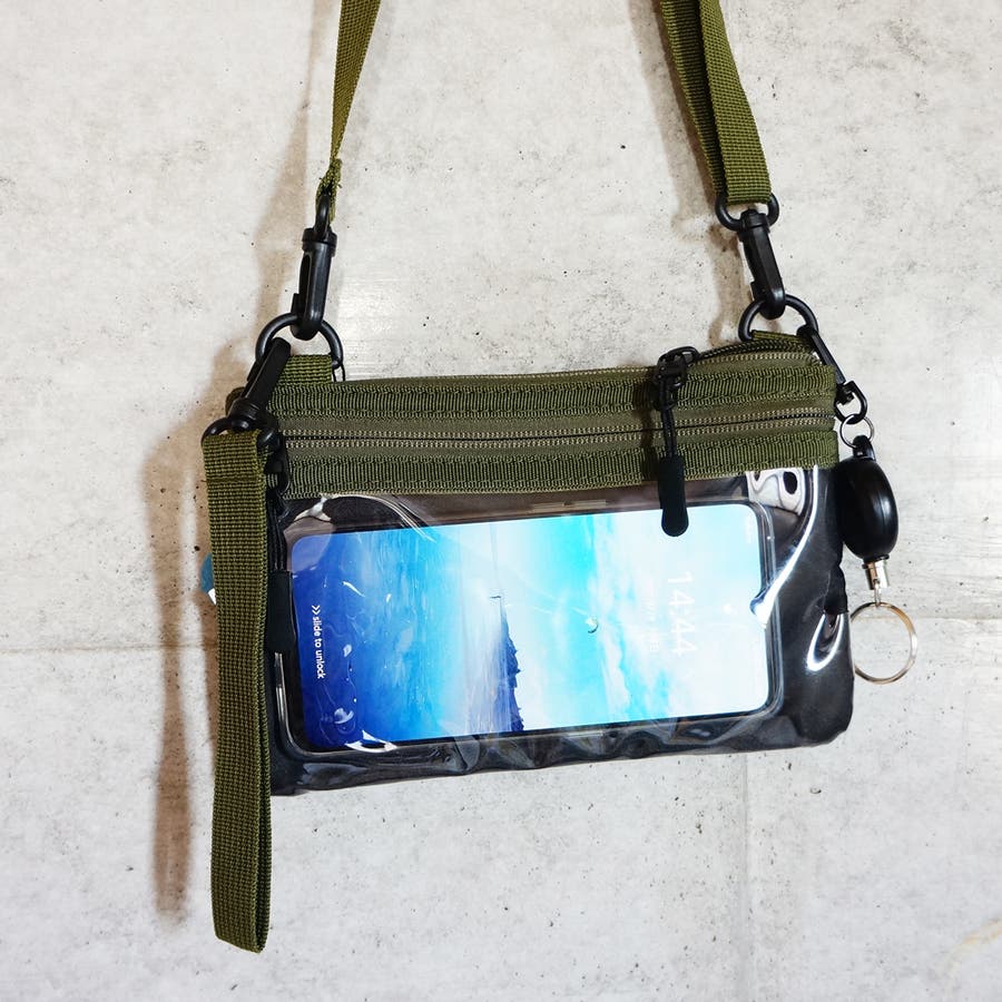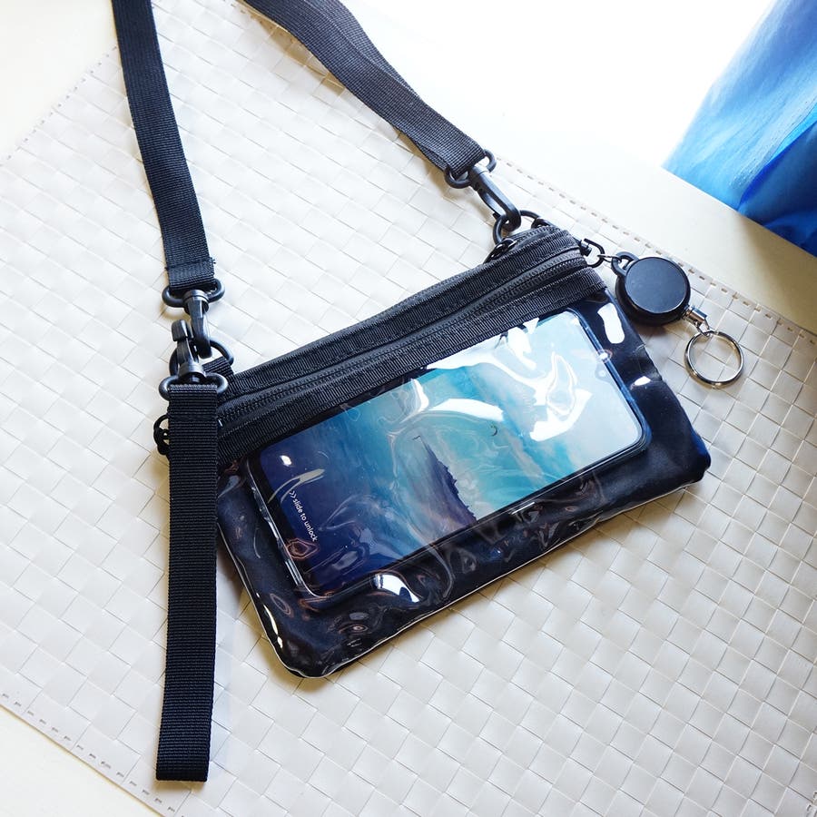バッグ背面のファスナーポケットはクリアになっているので、スマホを収納したまま操作ができます。
