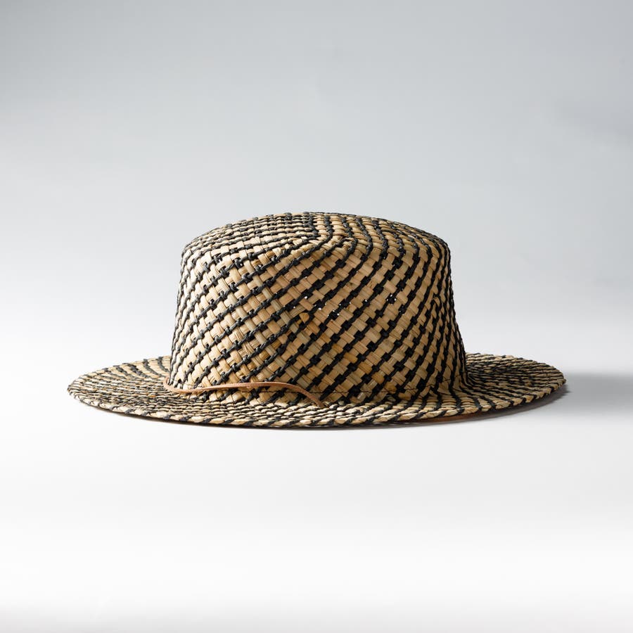 ヴィンテージのカンカン帽をベースに、ガマ草とペーパーを絶妙に編み上げた独自の柄が目を引く1点。