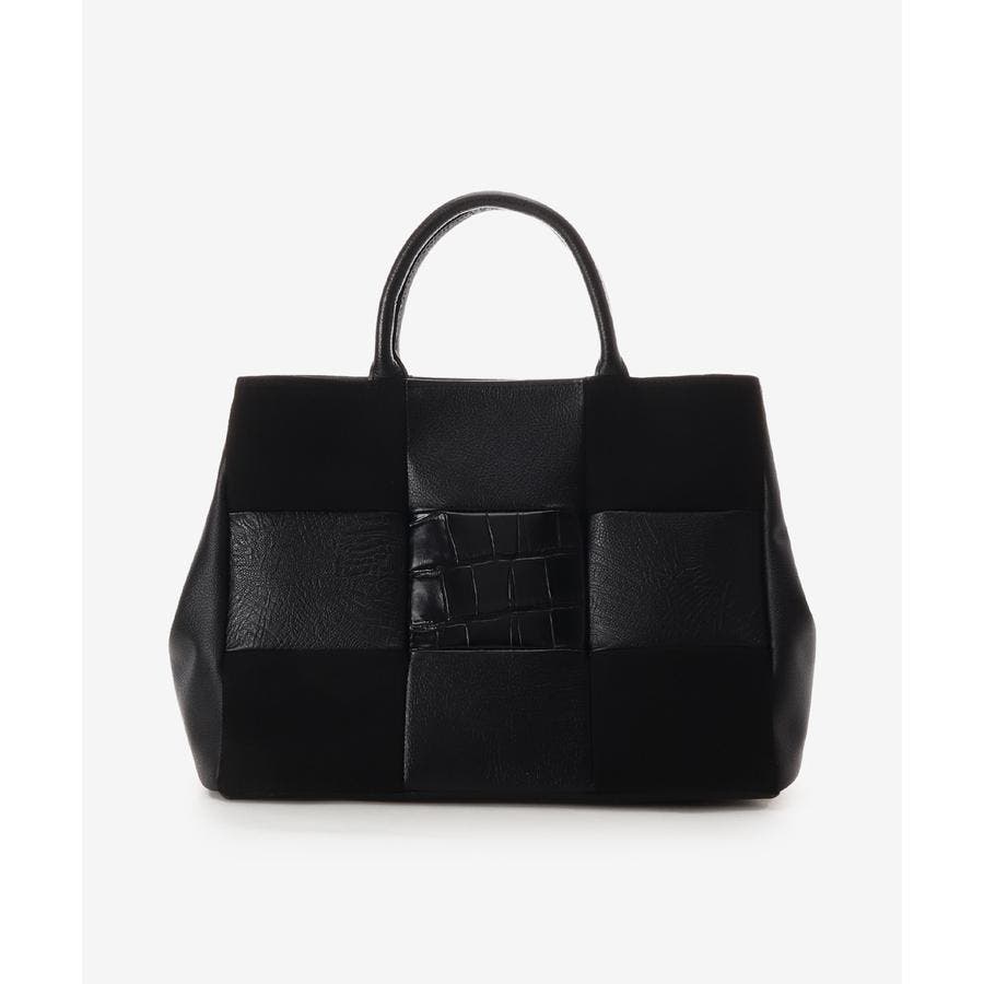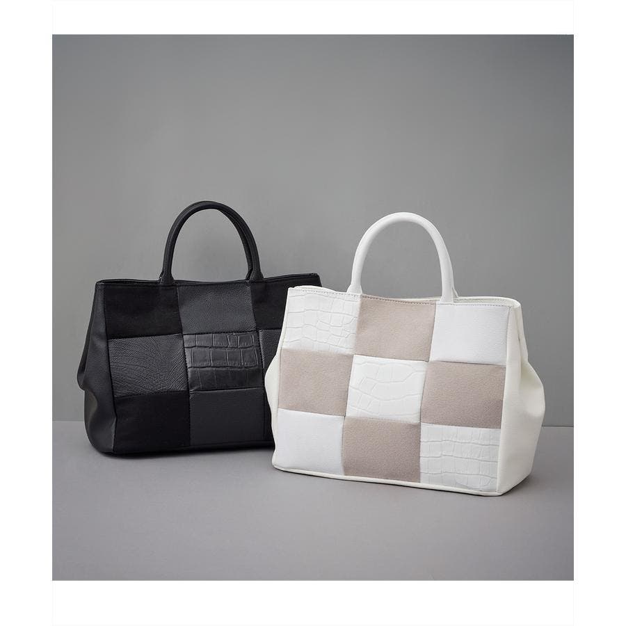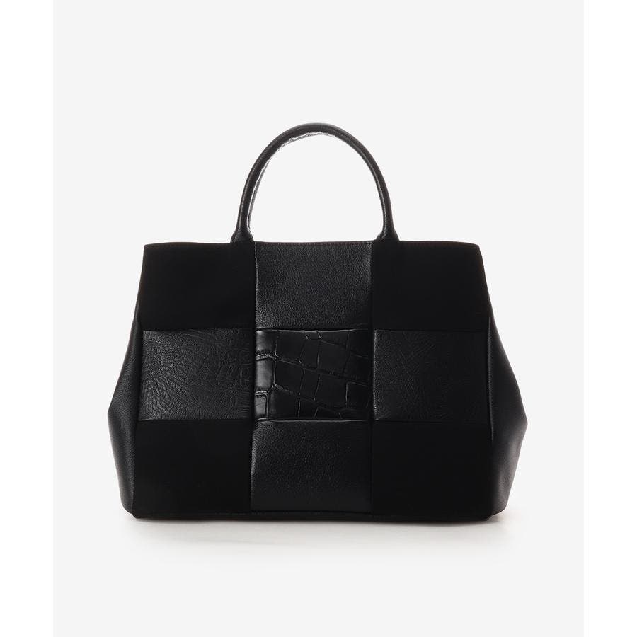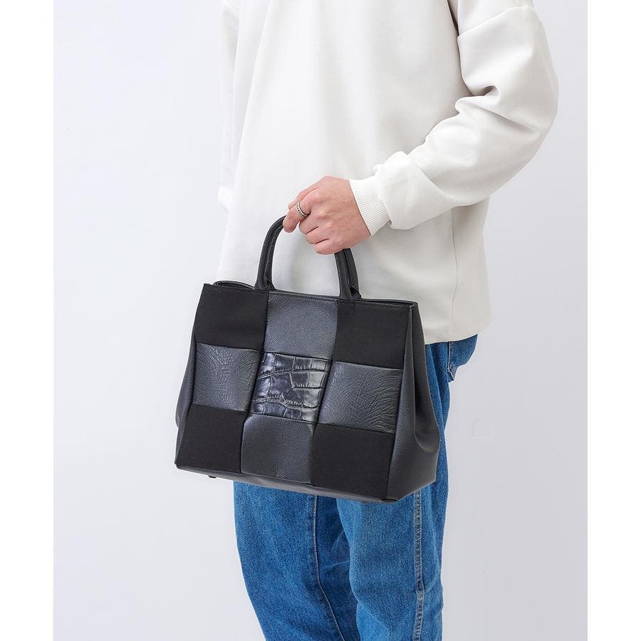 異なる表情のリサイクルレザーを組み合わせた、モードな印象のパッチワークハンドバッグ。