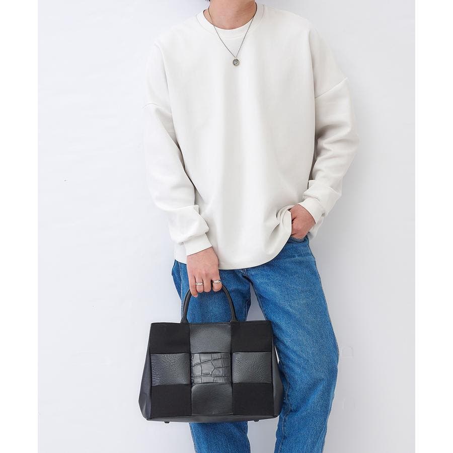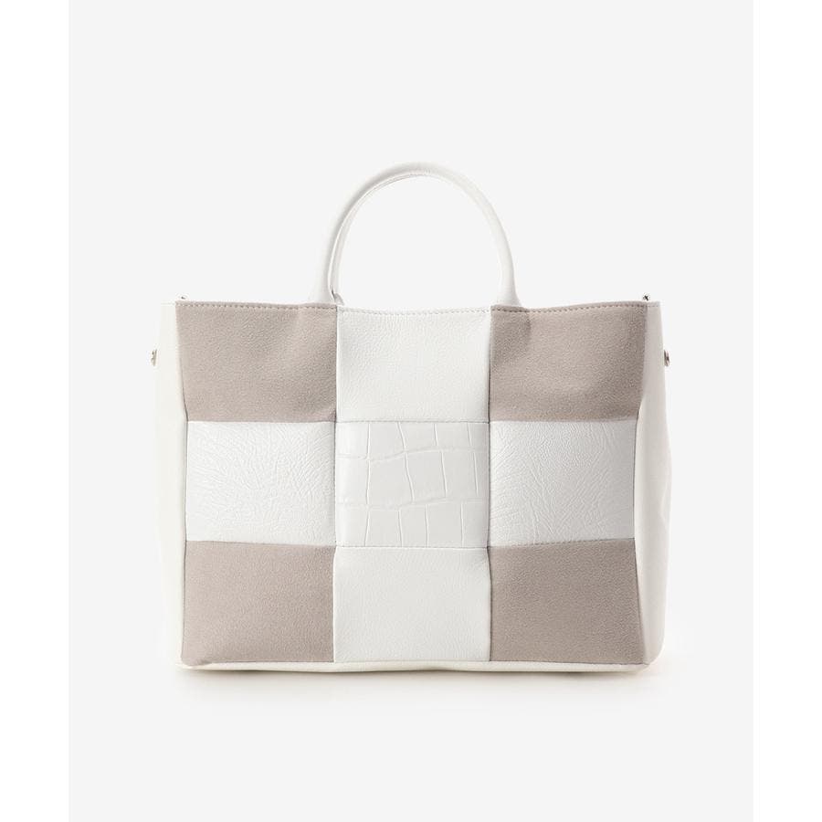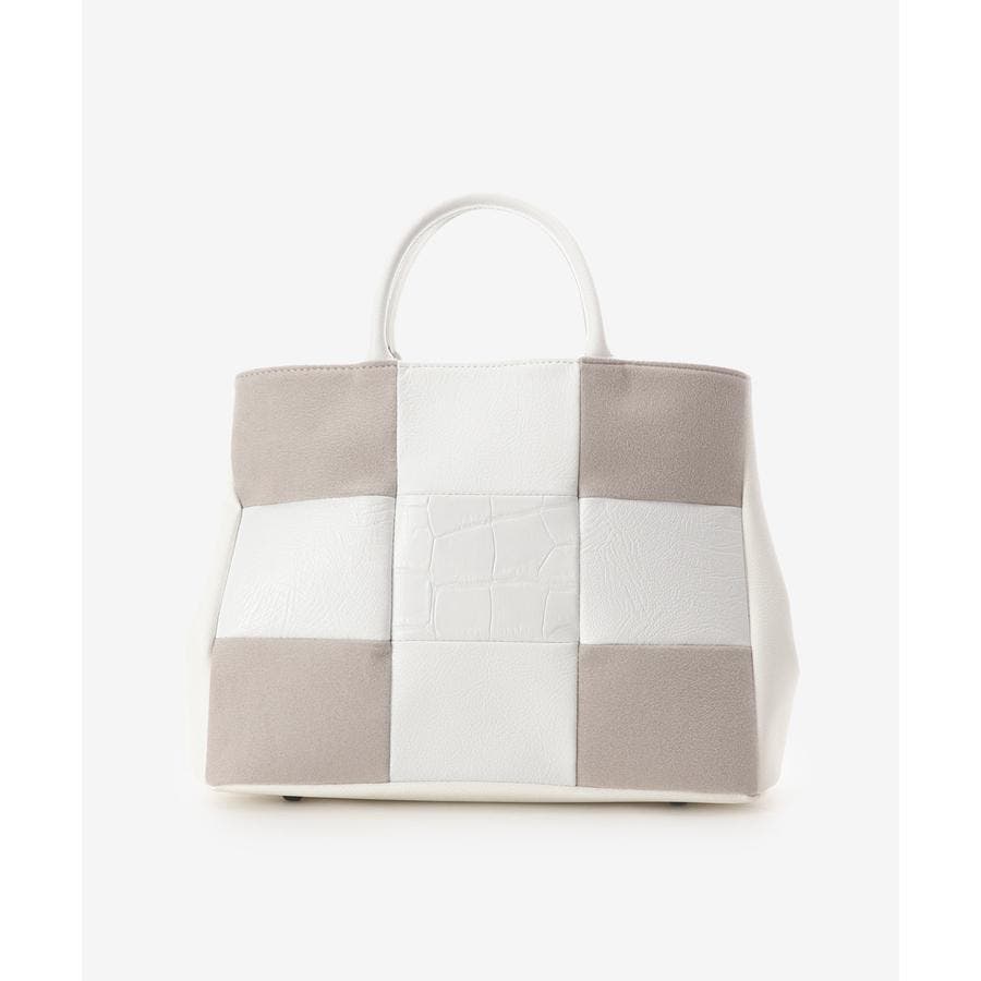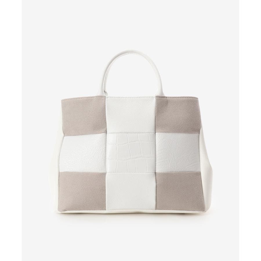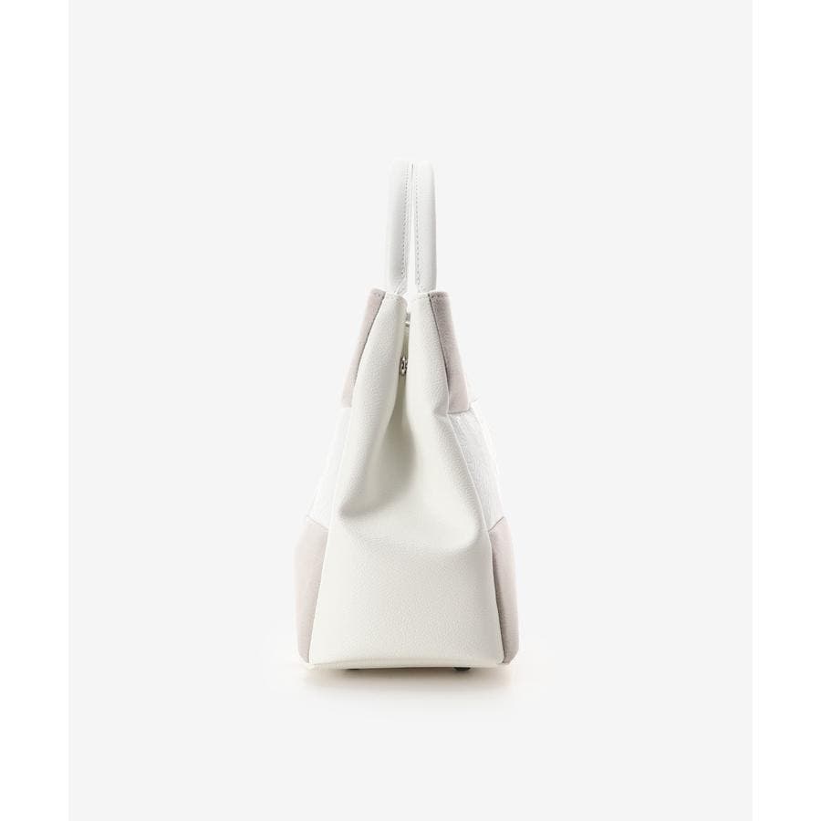 異なる表情のリサイクルレザーを組み合わせた、モードな印象のパッチワークハンドバッグ。