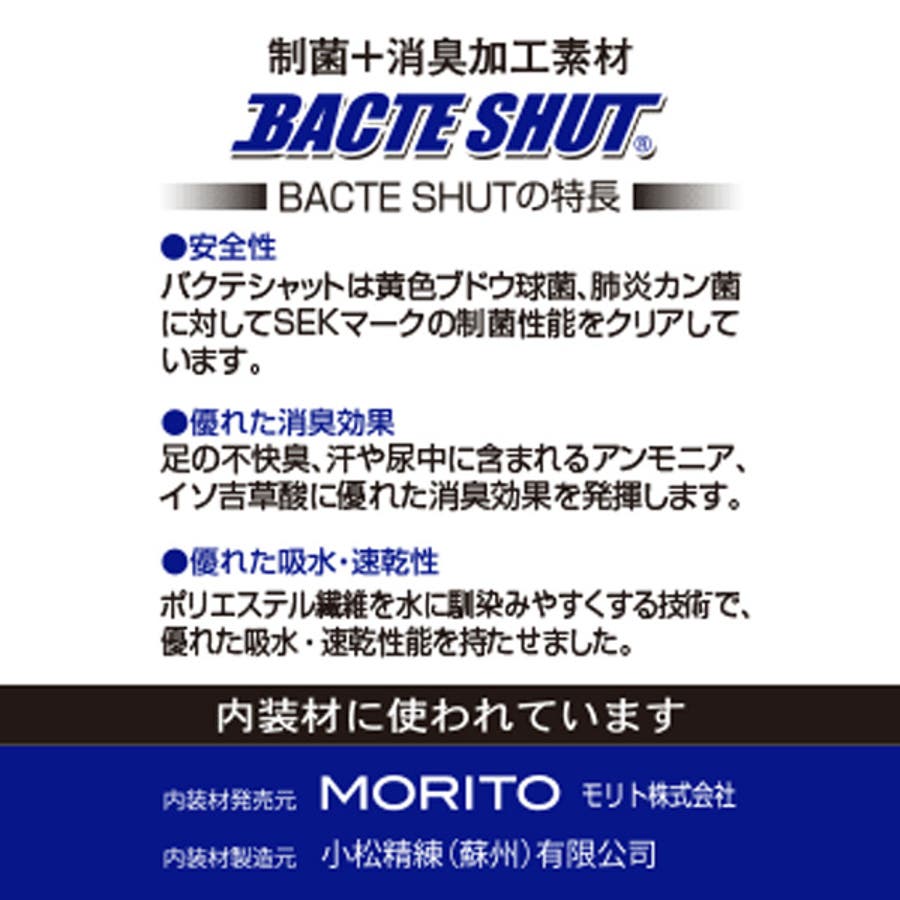 取り外せるカップインソールはクッション性と通気性に優れたハニカム構造。つま先には日本製の制菌+消臭加工材素材バクテシャットを使用しており、清潔さを保てます。