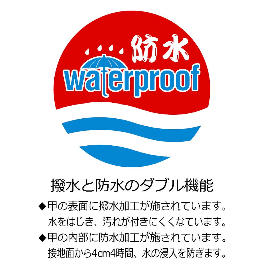 甲の内部に防水加工を施し、接地面から4cm4時間、水の浸入を防ぎます。甲の表面にも撥水加工を施しており、水を弾き汚れがつきにくくなりました。