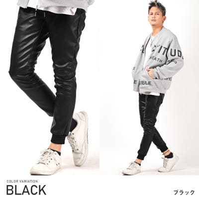 程よい光沢感が得られ、艶やかさが高級感とセンスの良さを演出してくれるPUレザーを採用したジョガーパンツ。