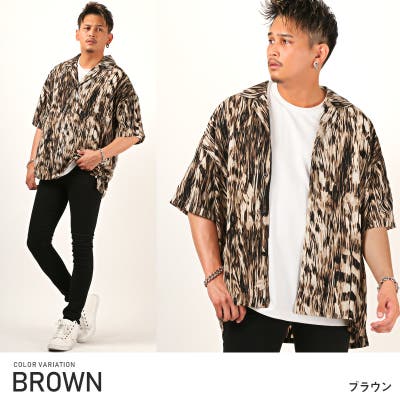 ゼブラ柄のようなさりげないアニマル要素が存在感抜群の総柄を落とし込んだオープンカラーシャツ。