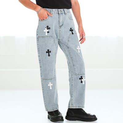 フロントに施されたクロス型のPUレザーワッペンが存在感抜群のデニムパンツ。