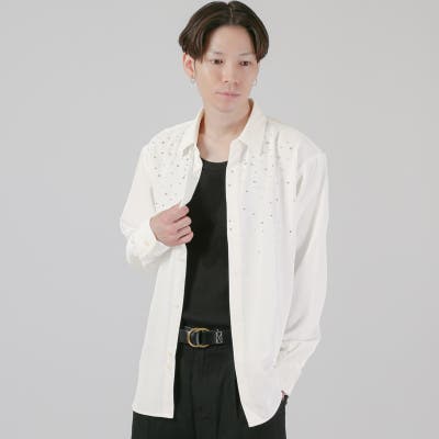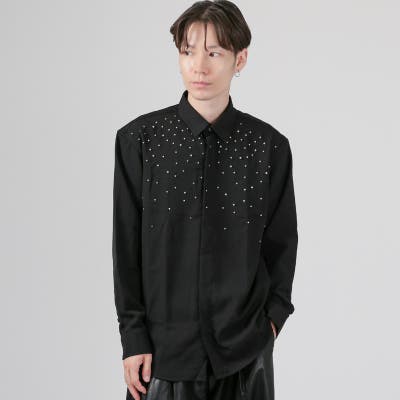 大胆に散りばめられたメタルパールストーンが視線を集める都会的な長袖シャツ。