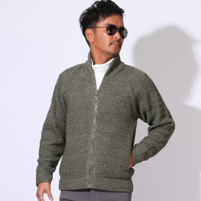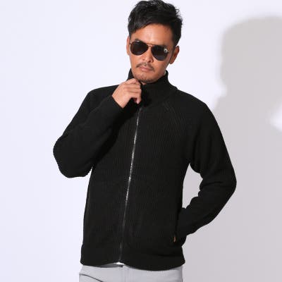 畦編みならではの縦畝が際立つ、存在感たっぷりのスタンドネックフルジップニットジャケット。