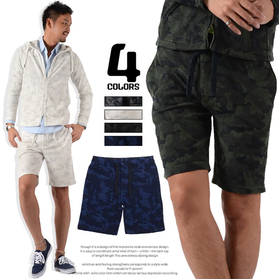 ■滑らかな肌触りが心地いいパイル地を使った総カモフラ柄が目を引くパイル地ハーフパンツの登場。