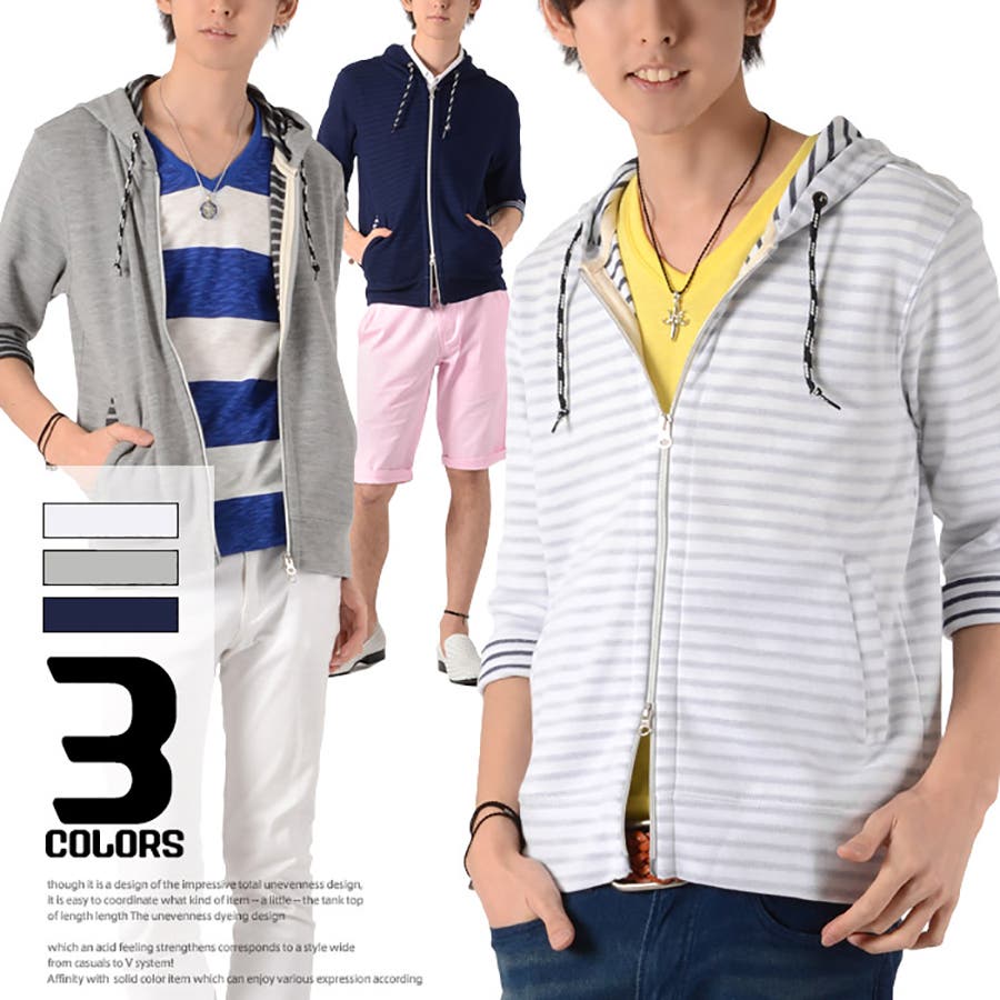 ■裏地に細めのボーダーをプリントした七分袖パーカーで、表面からうっすらとボーダーが透けているのがポイント!