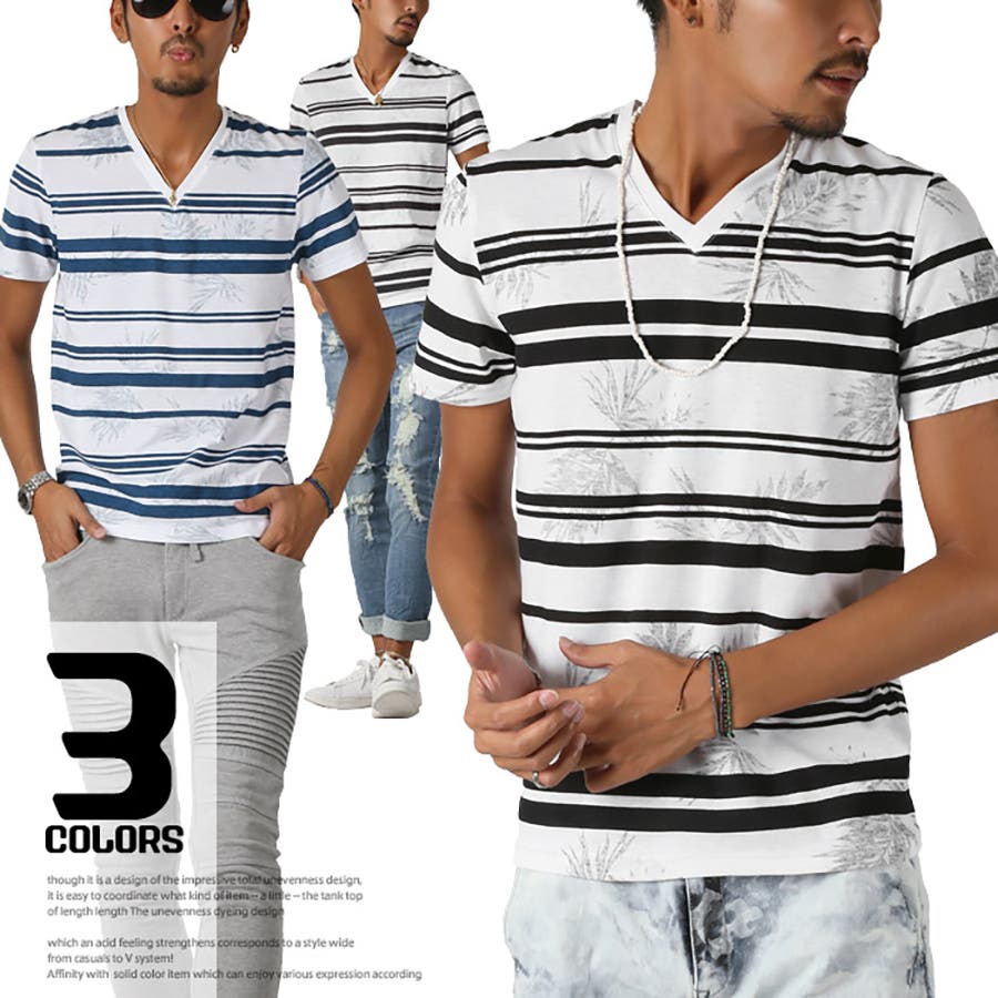■ピッチの違うボーダーをランダムに入れ、人気のボタニカル柄を裏プリントしたVネック半袖Tシャツです。