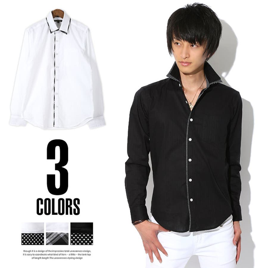 「二枚襟チェック&ドット切替シャドーストライプ長袖シャツ」