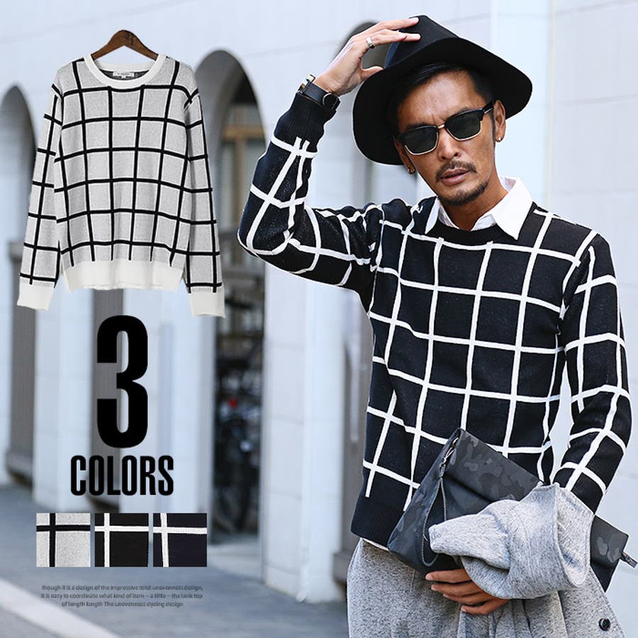 ジャガード編みでウインドペンチェック柄をデザインしたニットセーター。