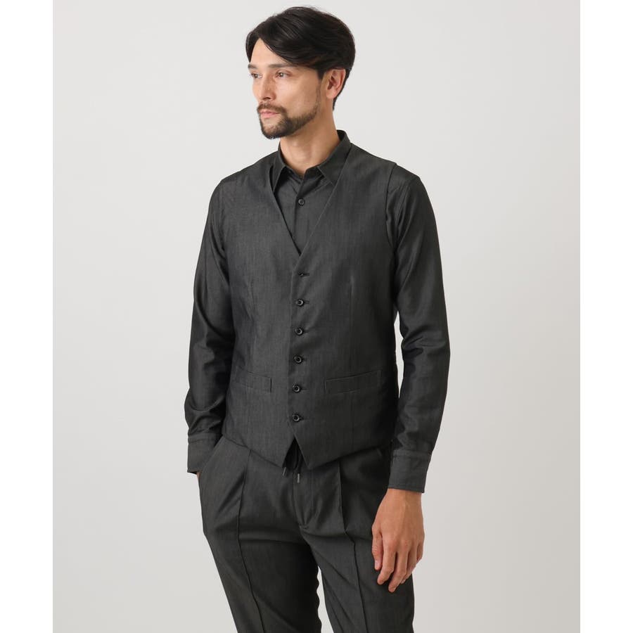・同素材のベストやパンツと合わせることで、統一感のあるセットアップ風の着こなしが完成。スッキリとした印象ながら、柔らかさも備えた大人の装いに。